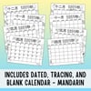 A ready-to-print 12 month calendar in Mandarin for kids. Includes 3 versions: dated, tracing, and blank version.