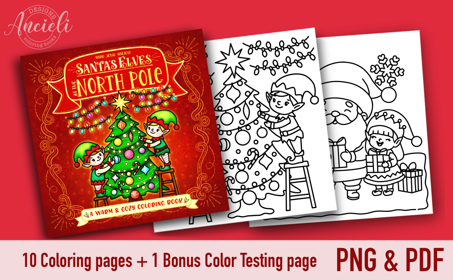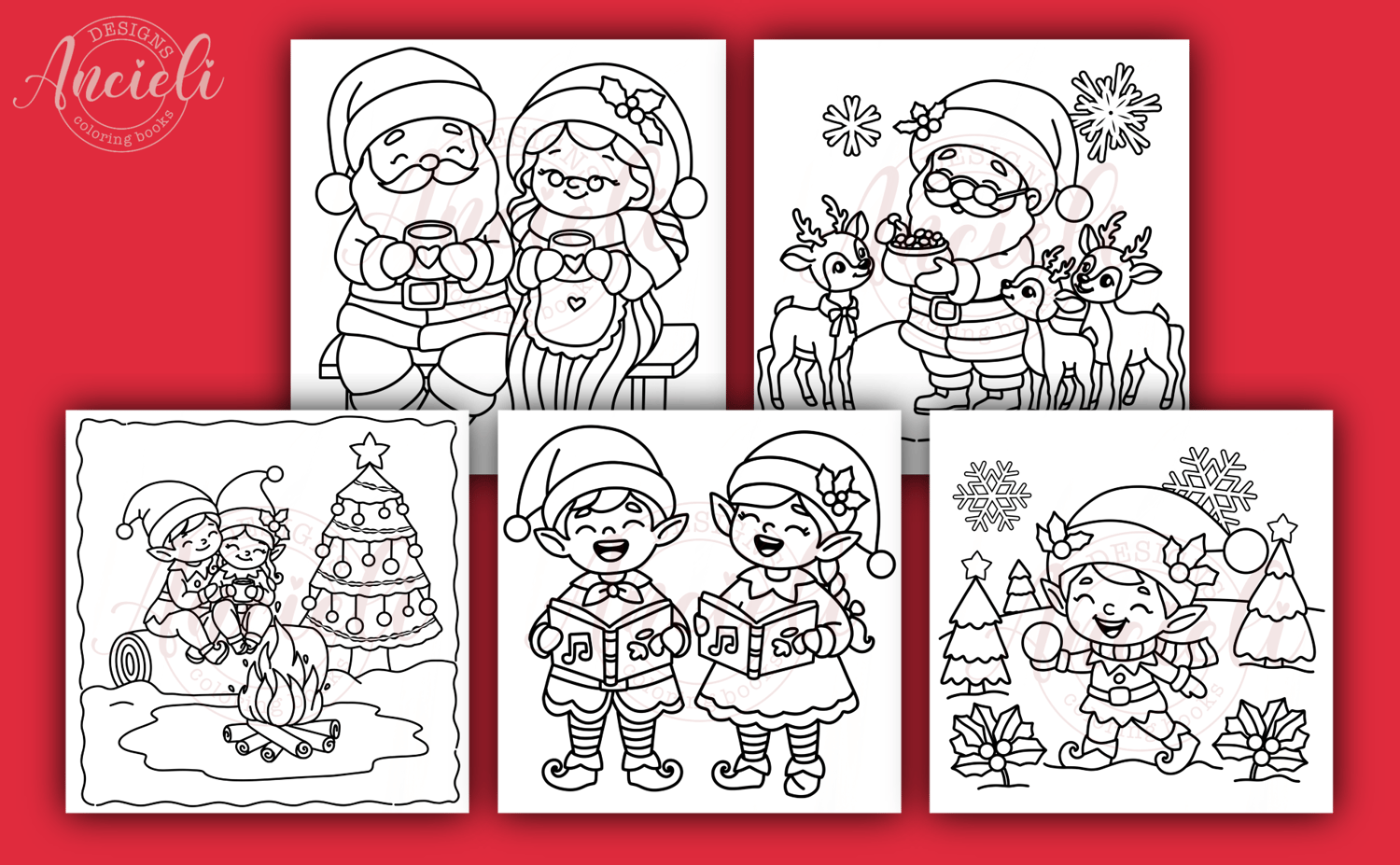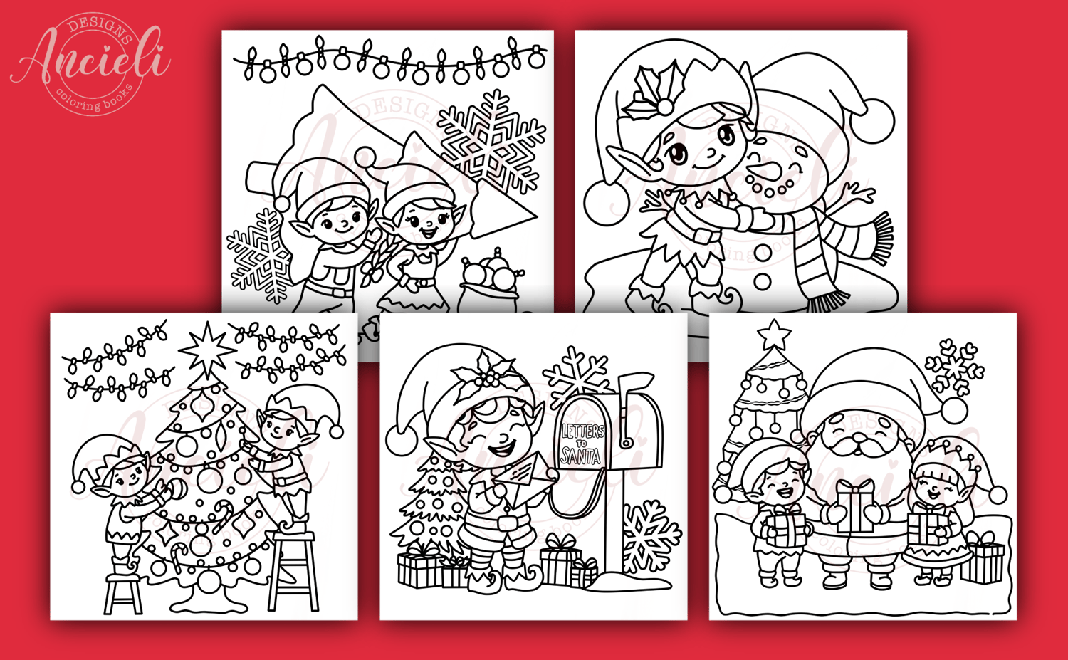 Elves and Santa celebrating Christmas - 10 coloring pages digital download