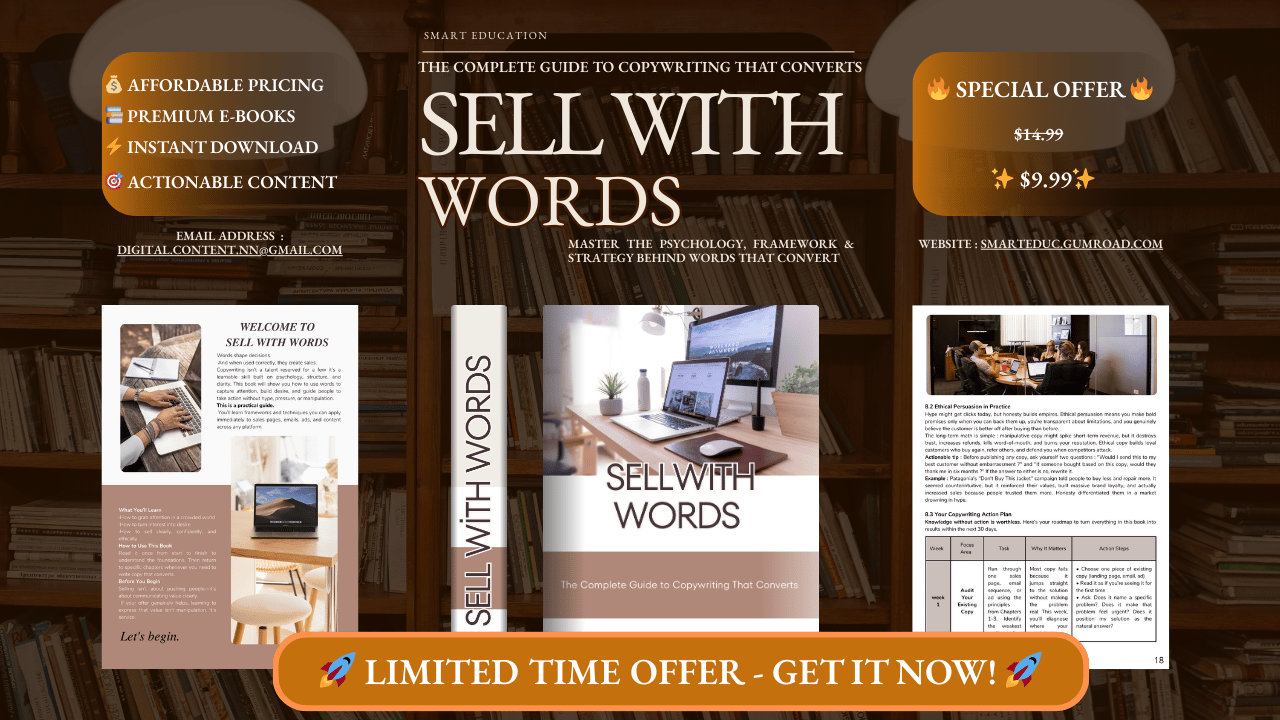 Sell With Words is a practical, no-fluff guide to copywriting for entrepreneurs, creators, freelancers, and anyone who needs to communicate value clearly and confidently. This book shows you how to turn words into action using proven psychology, simple frameworks, and ethical persuasion.