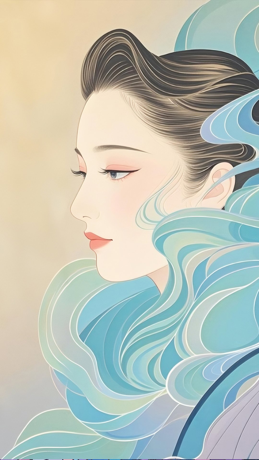 This work has a taste of Japanese painting, but is finished as modern and sophisticated AI art. A woman wrapped in a flowing blue motif reminiscent of the wind, creates a calm and tranquil atmosphere with transparent colors that make use of delicate lines and gradations. It has a poetic and tranquil view of the world that makes viewers feel the flow of nature, such as wind, water, and air.