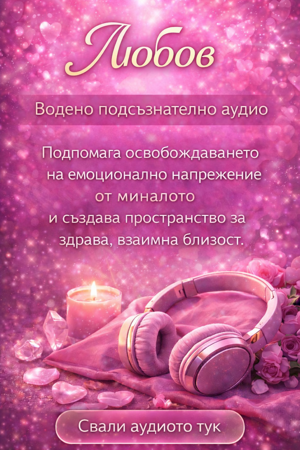 Записът „Любов“ подпомага освобождаването на натрупано емоционално напрежение от минали преживявания и създава вътрешно пространство за по-здрава, спокойна и взаимна близост.