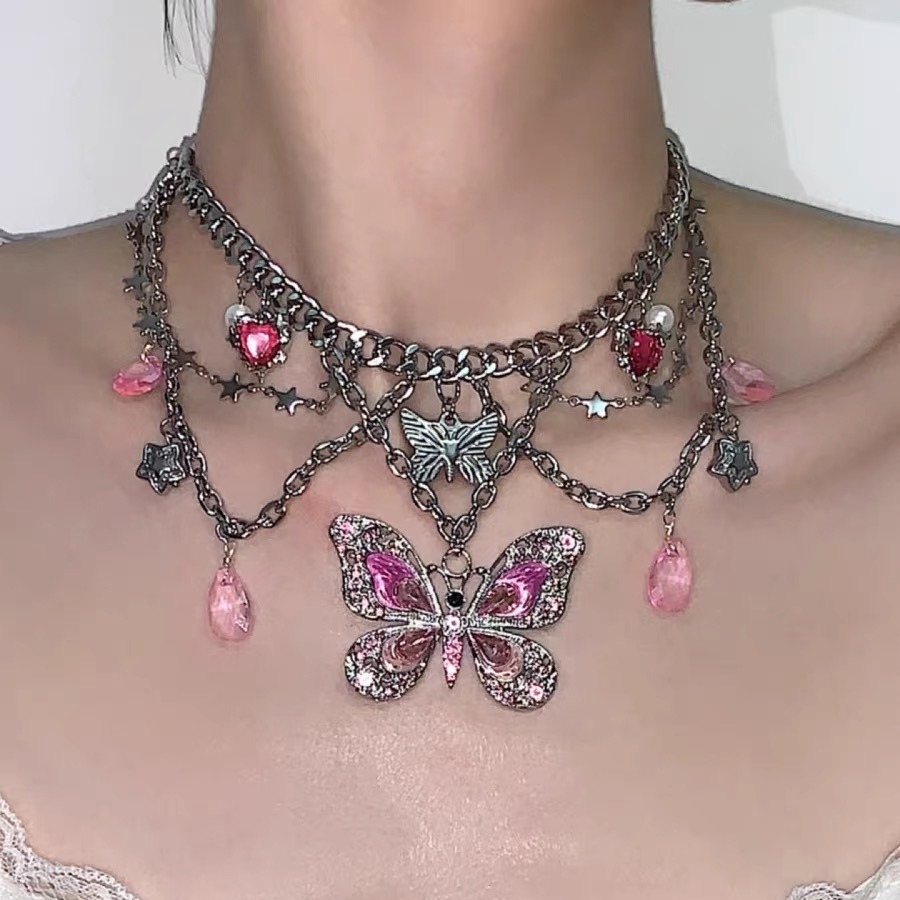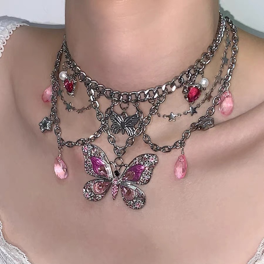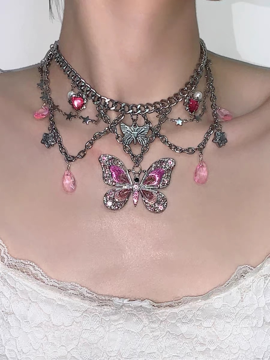 Barbie Butterfly Y2K pink butterfly titanium steel rhinestone star heart necklace waist chain 2 ways to wear