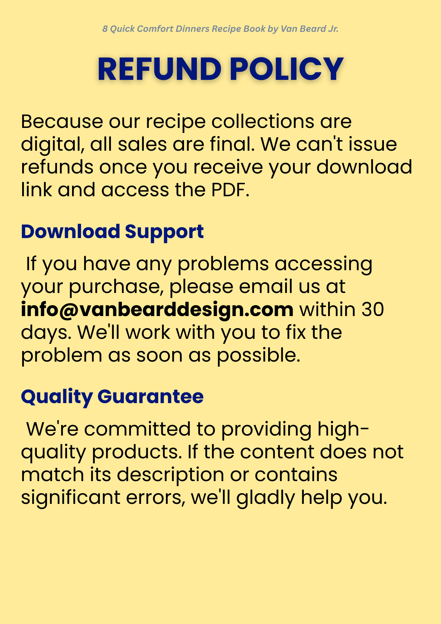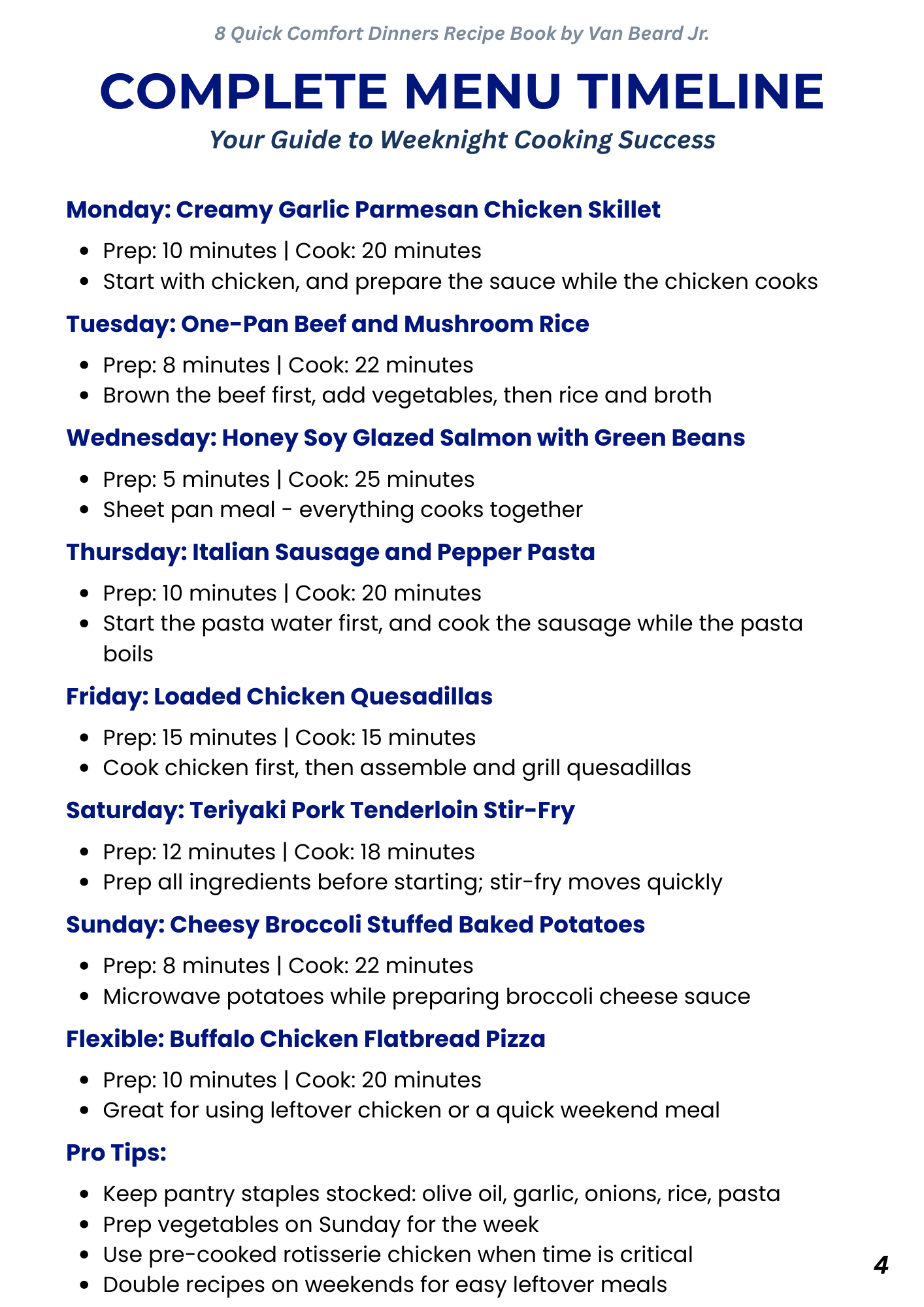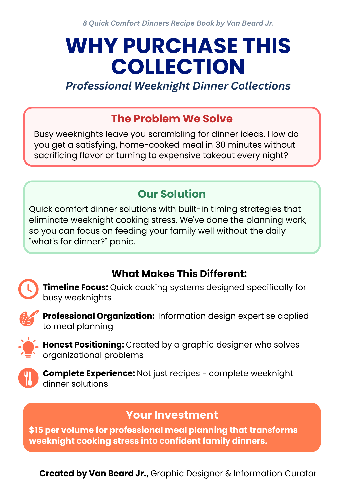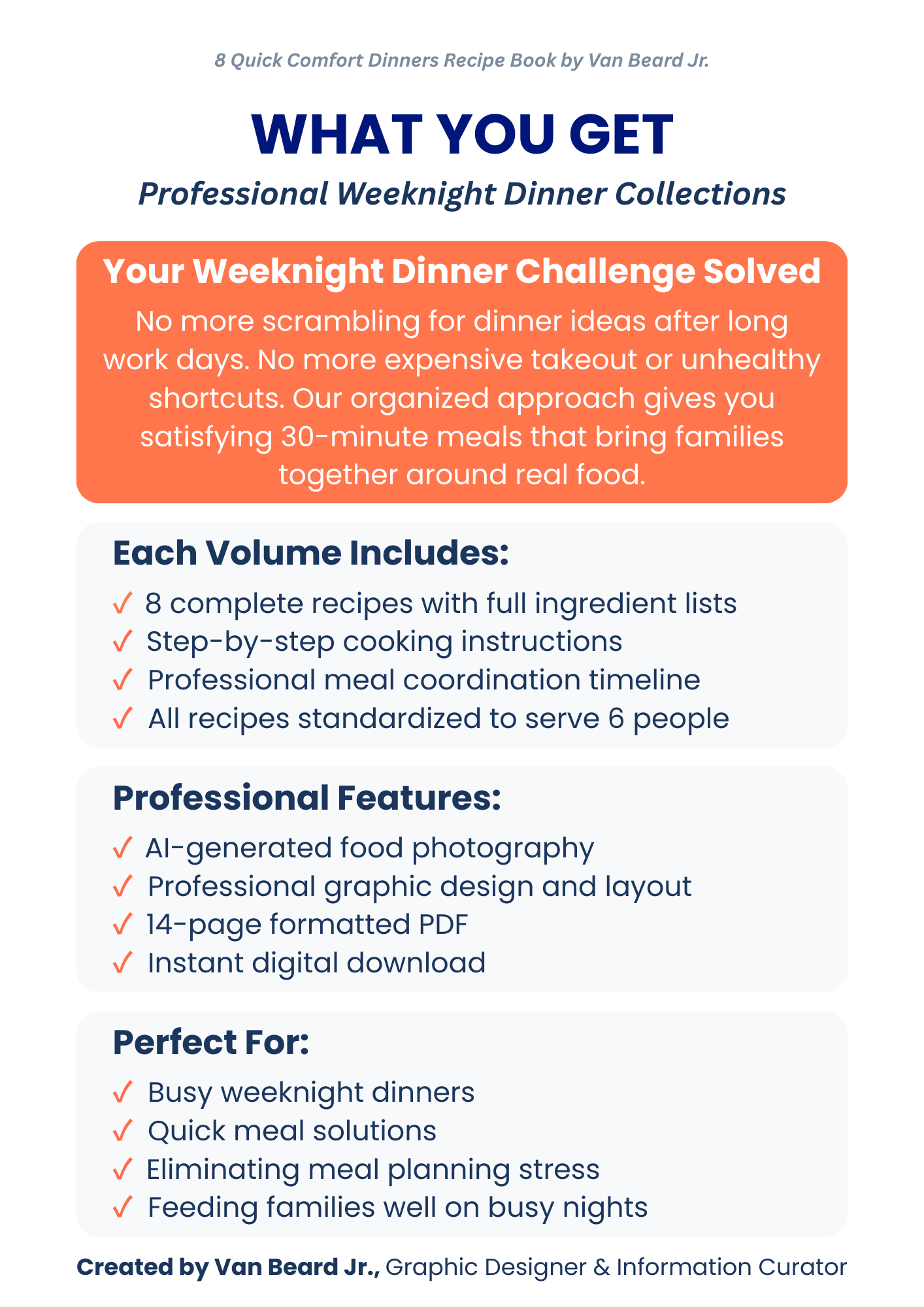 OUR SOLUTION: Eight carefully curated comfort dinner recipes with built-in timing strategies that eliminate weeknight cooking stress. We've done the planning work so you can focus on feeding your family well.