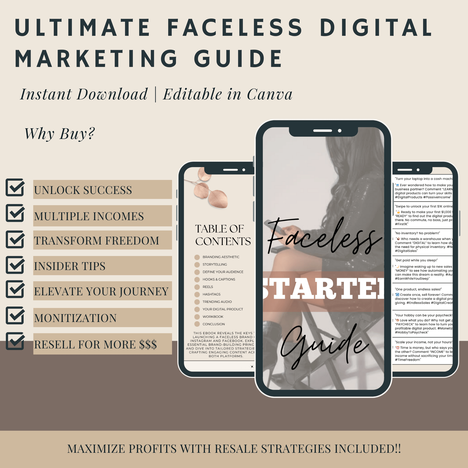 Dive into the digital realm with our 26 Page - Ultimate Faceless Digital Marketing Guide! Packed with insider tips and strategies, this guide is your key to unlocking multiple streams of income. Whether you're new to the digital game or a seasoned pro, this treasure trove will elevate your online presence and boost your earnings. Plus, it's fully customizable—reuse it, add your touch, and even resell for extra income. Get ready to turn your digital dreams into reality!