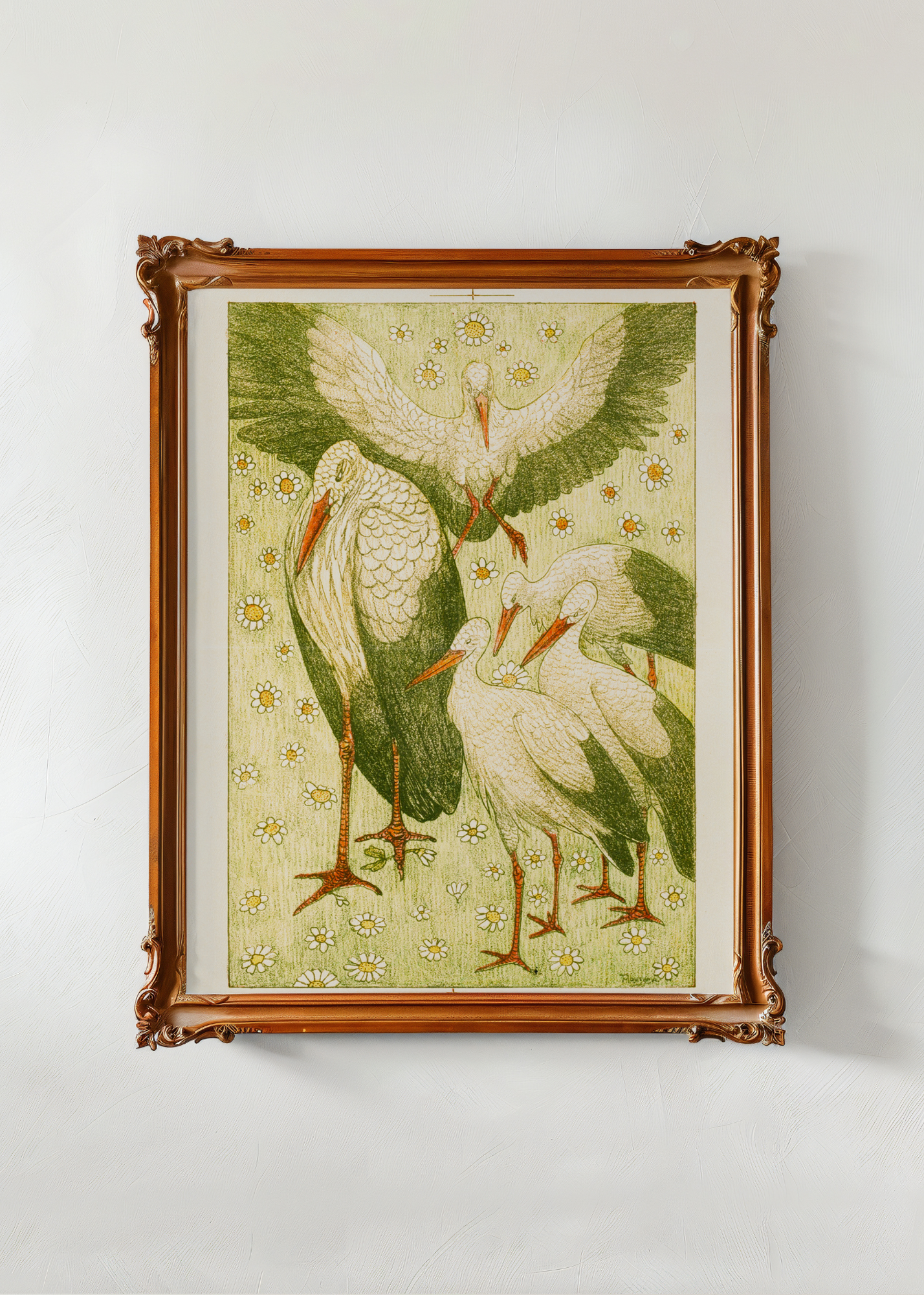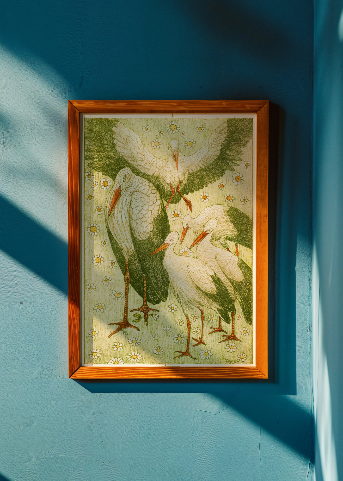 Five Storks in A Meadow— In this gentle composition, five storks linger quietly in an open meadow—long-legged and still, like brushstrokes of grace against the hush of nature. Van Hoytema captures a moment suspended in calm, where sky meets field and time seems to stretch. With his signature softness and earthy tones, the scene becomes a lullaby of summer light and quiet belonging. A piece that invites pause, and the slow unfolding of wonder.