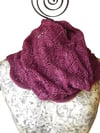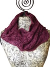 Cowl is knit in the round from one end straight through to the other. The lace is easy to do, especially once you find your rhythm, and is very pleasing. I’ve provided four different sizing options, but many more are possible by simply changing the number of times the motif is worked in a circle, and how many times the rows are worked.