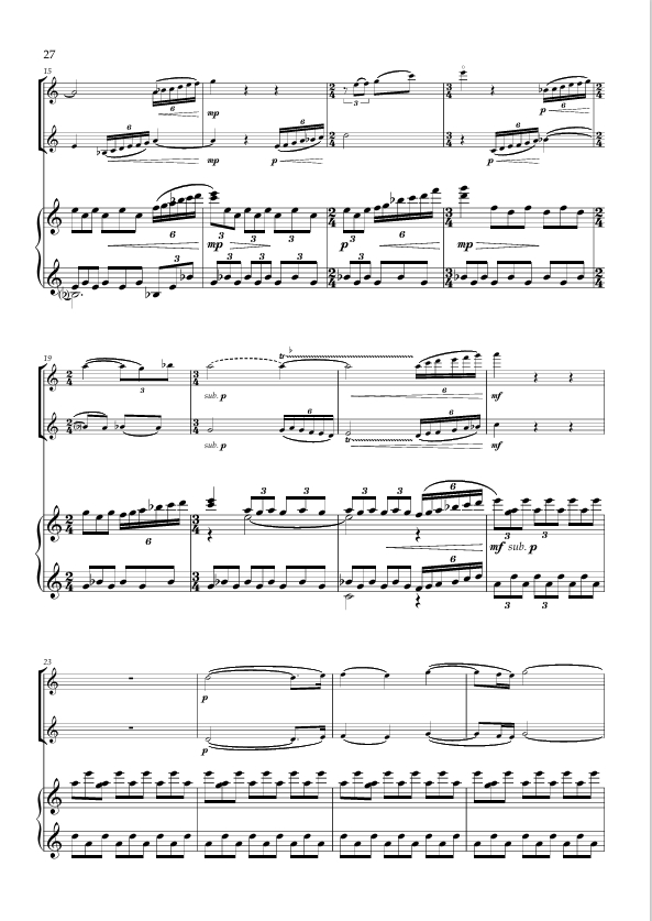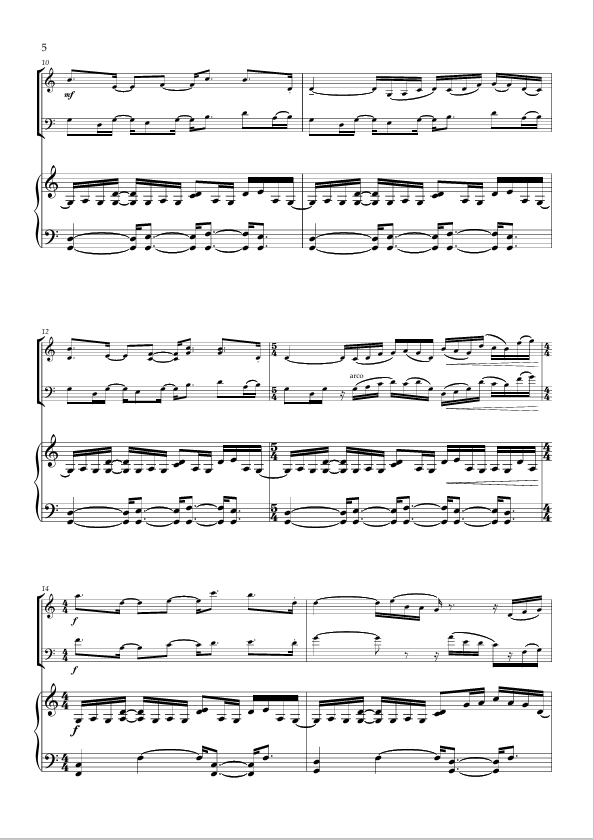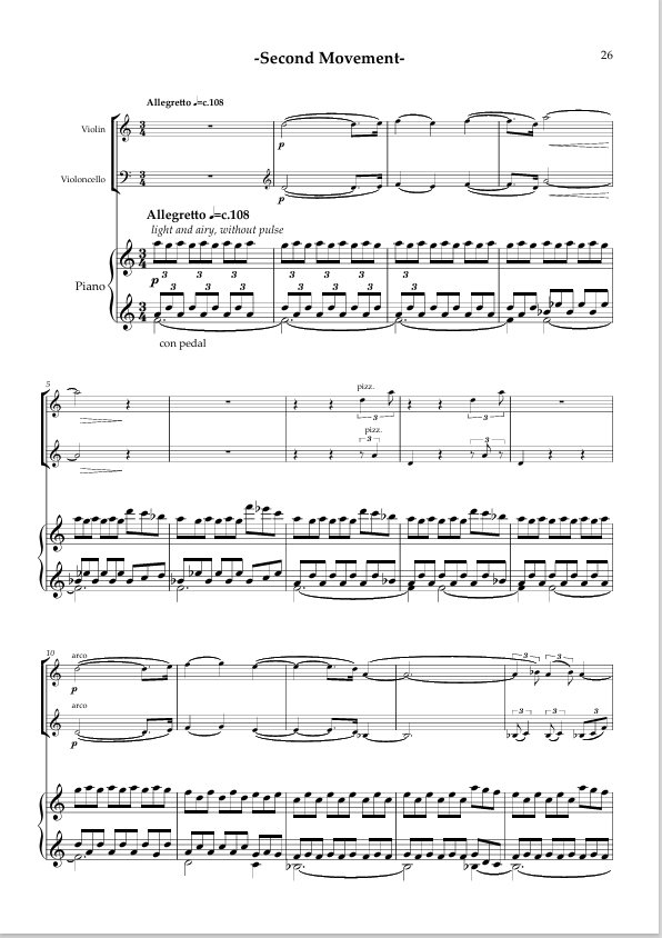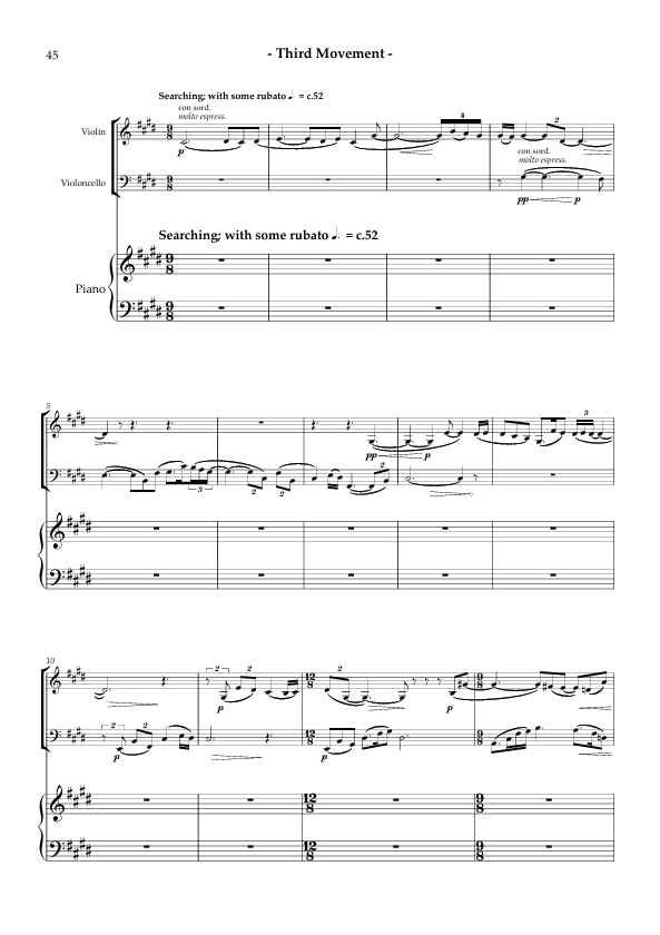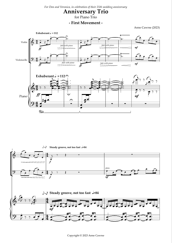 The opening two movements are dedicated in turn to Don and Veronica, reflecting upon elements of their individual lives and personalities, and containing hidden (or not so hidden!) references to some of their personal musical loves. The final movement begins as an intimate duo between the violin and cello, bringing together thematic material from the opening two movements. The work culminates in a free-wheeling and exuberant dance-like celebration, characterised by a continuously modulating cycle 25 pulses in length.