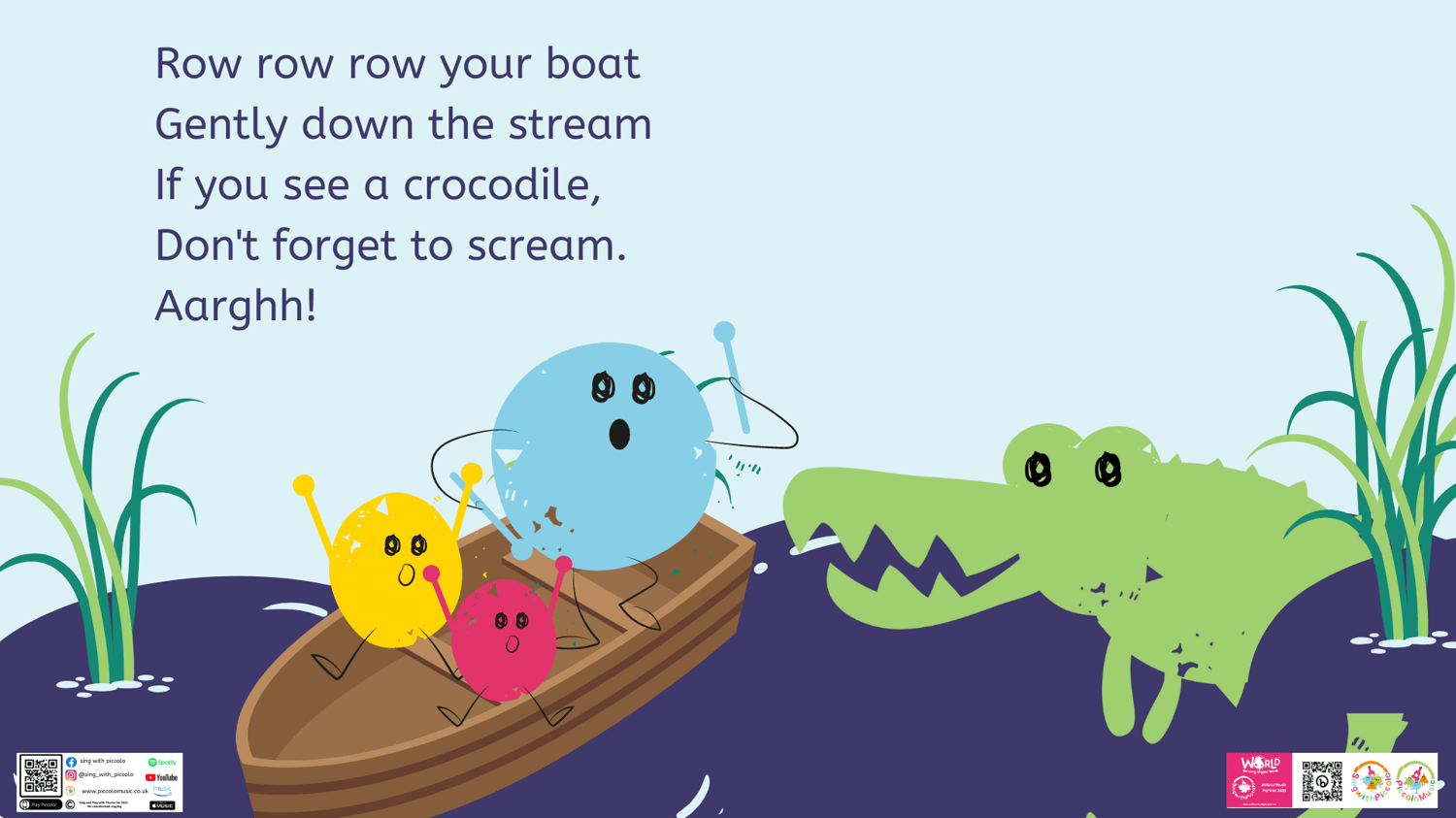 Row Row Row your boat is a favourite to World Nursery Rhyme Week. Piccolo's version takes you down the stream, out to sea with the pirates and screaming at crocodiles.