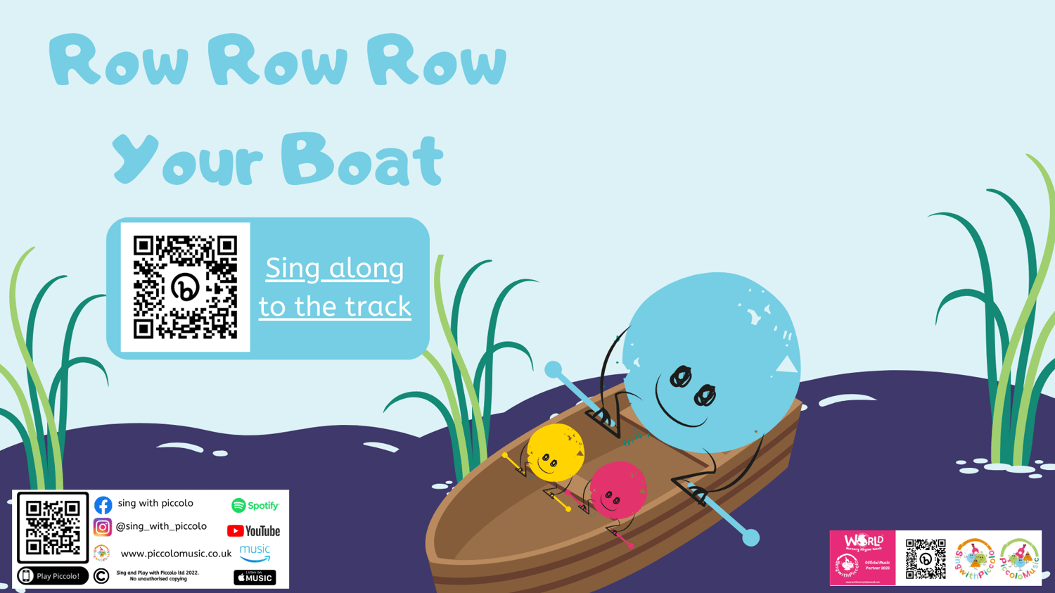 Download Piccolo's illustrated lyrics sheets for 'Row Row Row Your Boat' one of the featured rhymes for World Nursery Rhyme Week 2023. The lyric sheets are great for singing along too on a whiteboard or to use as print outs in class!