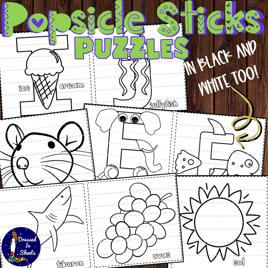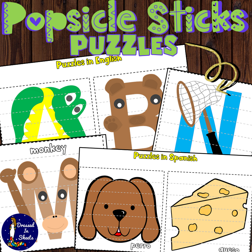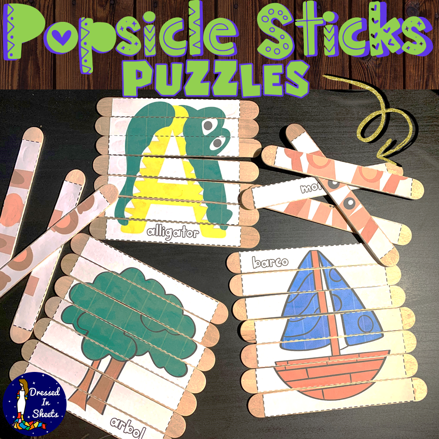 With the puzzles in Spanish the kiddos will have puzzles for: arbol, barco, carro, chango, dado, elefante, foco, gato, hielo, iguana, jirafa, koala, leon, llave, manzana, nido, ñandu, oso, perro, queso, rata, sol, tiburon, uvas, vaca, wafle, xilofono, yo-yo, zapato.