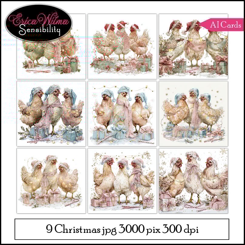 Bring holiday cheer to your crafting projects with this delightful set of 9 Christmas chicken cardfronts. Each design features charming festive hens adorned with Santa hats, winter scarves, soft pastel accessories, twinkling lights, and beautifully wrapped presents. The warm, whimsical illustrations create a joyful and cozy Christmas atmosphere โ perfect for handmade cards, scrapbooking, journaling, tags, and festive decorations.