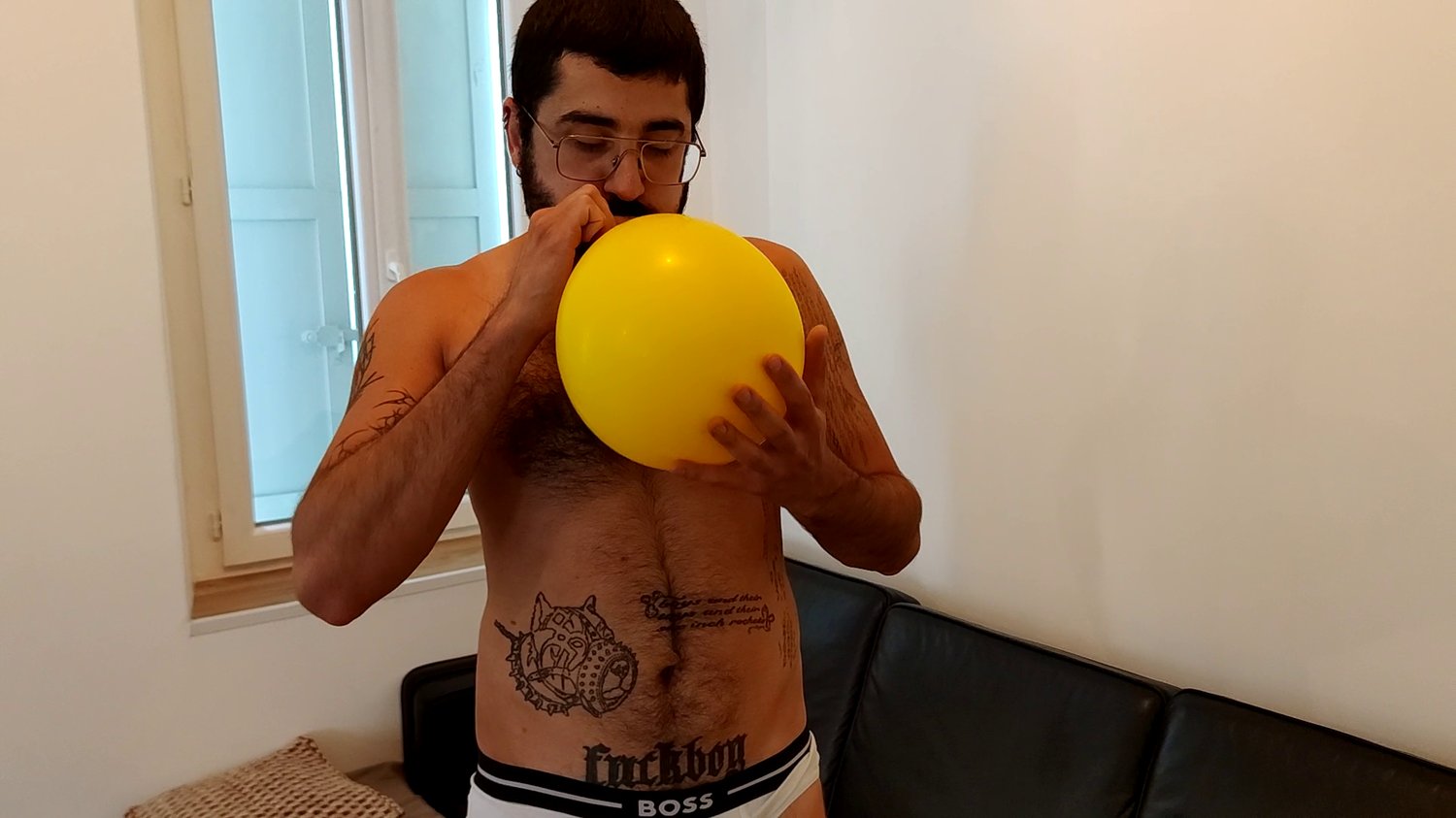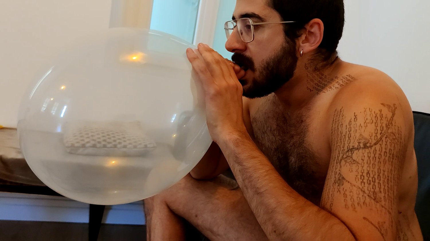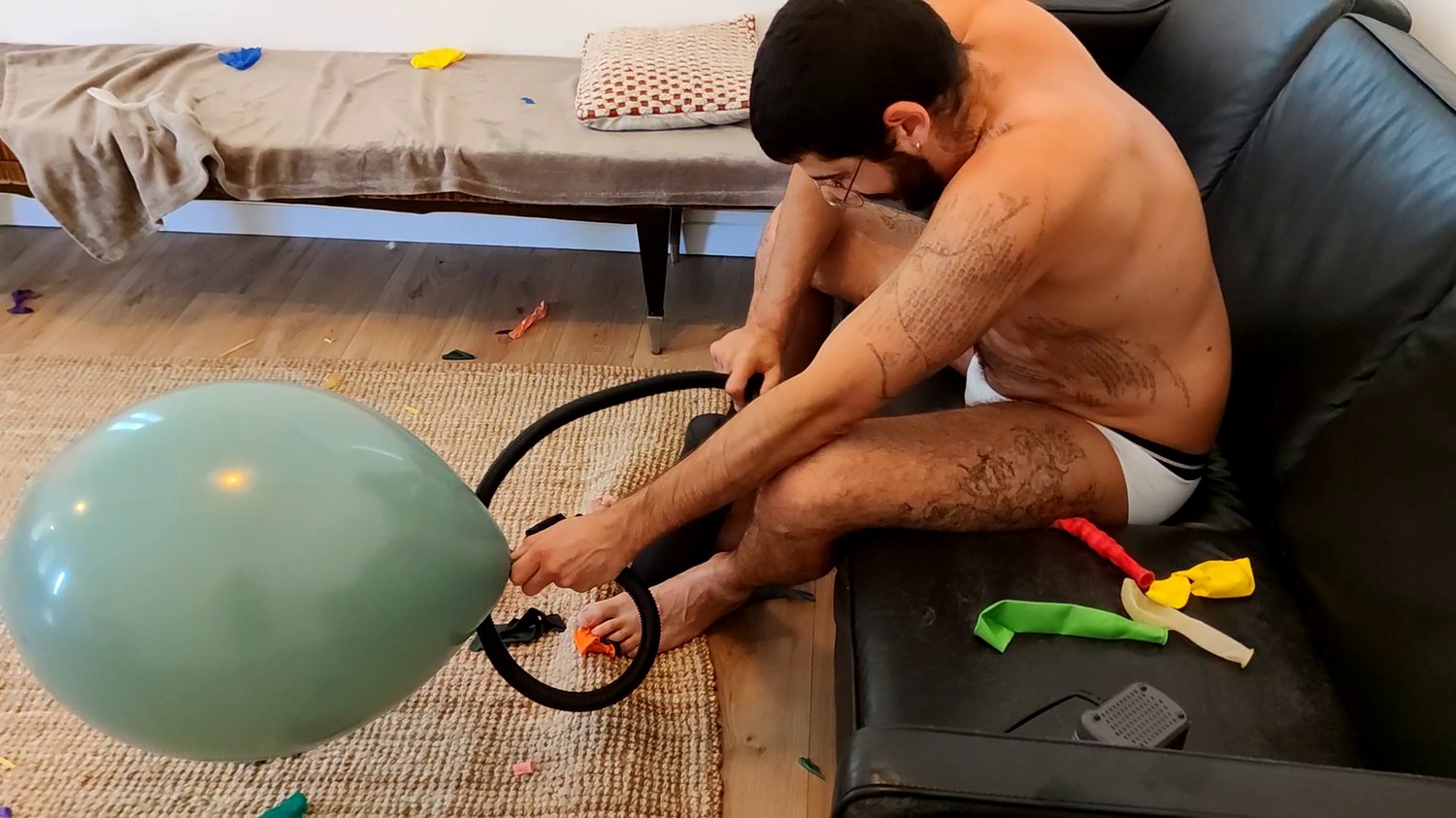 In this video Nelson blow balloons, with his mouth or with a manual pump.