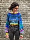 The AquaMarline was made to give you permission to play! Play with color, play with fiber, play with different yarn weights, play with your stash & scraps! This cropped sweater with bubble sleeves is worked from the bottom-up with no seaming. The marled, rainbow fabric is created by holding different yarns together and switching/swapping as you go.