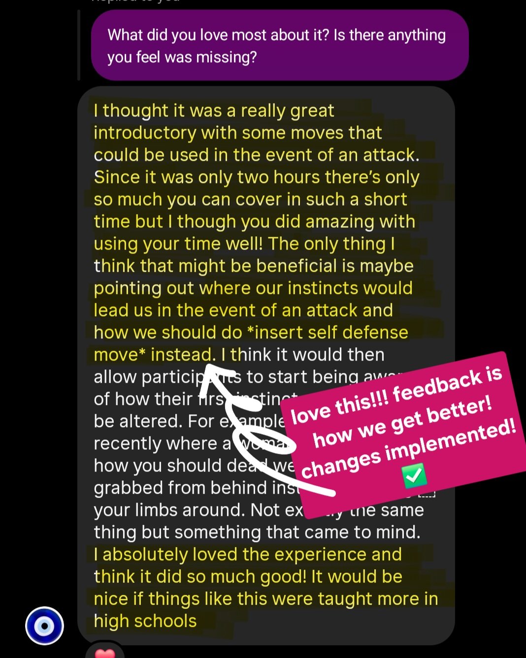 Our beginner-friendly self-defense skills (no experience needed) will include scenarios such as wrist locks, defensive conflict de-escalation techniques, and strategies to maximize your safety!