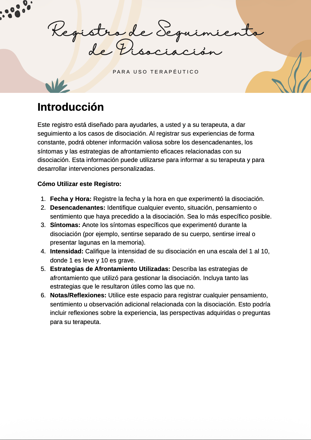 ✨Si buscas una manera práctica y compasiva de comprender mejor la disociación y apoyar tu progreso terapéutico, este registro fue creado para aportar claridad, seguridad y mayor comprensión al proceso de sanación.