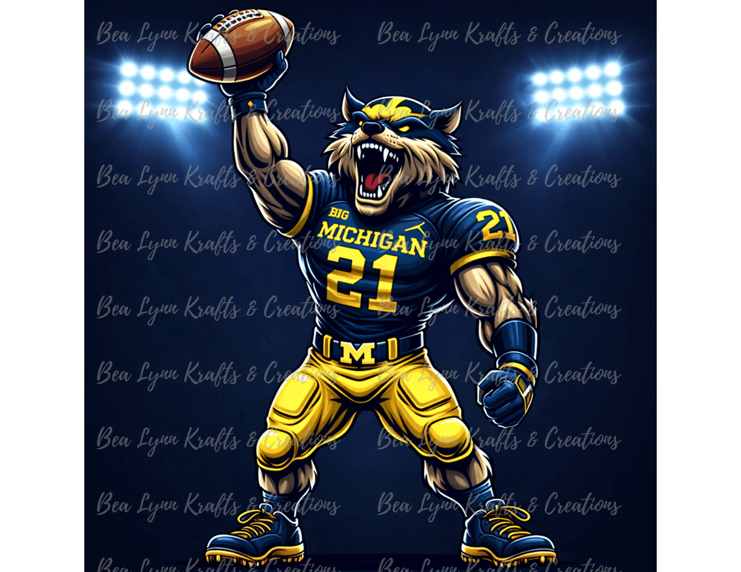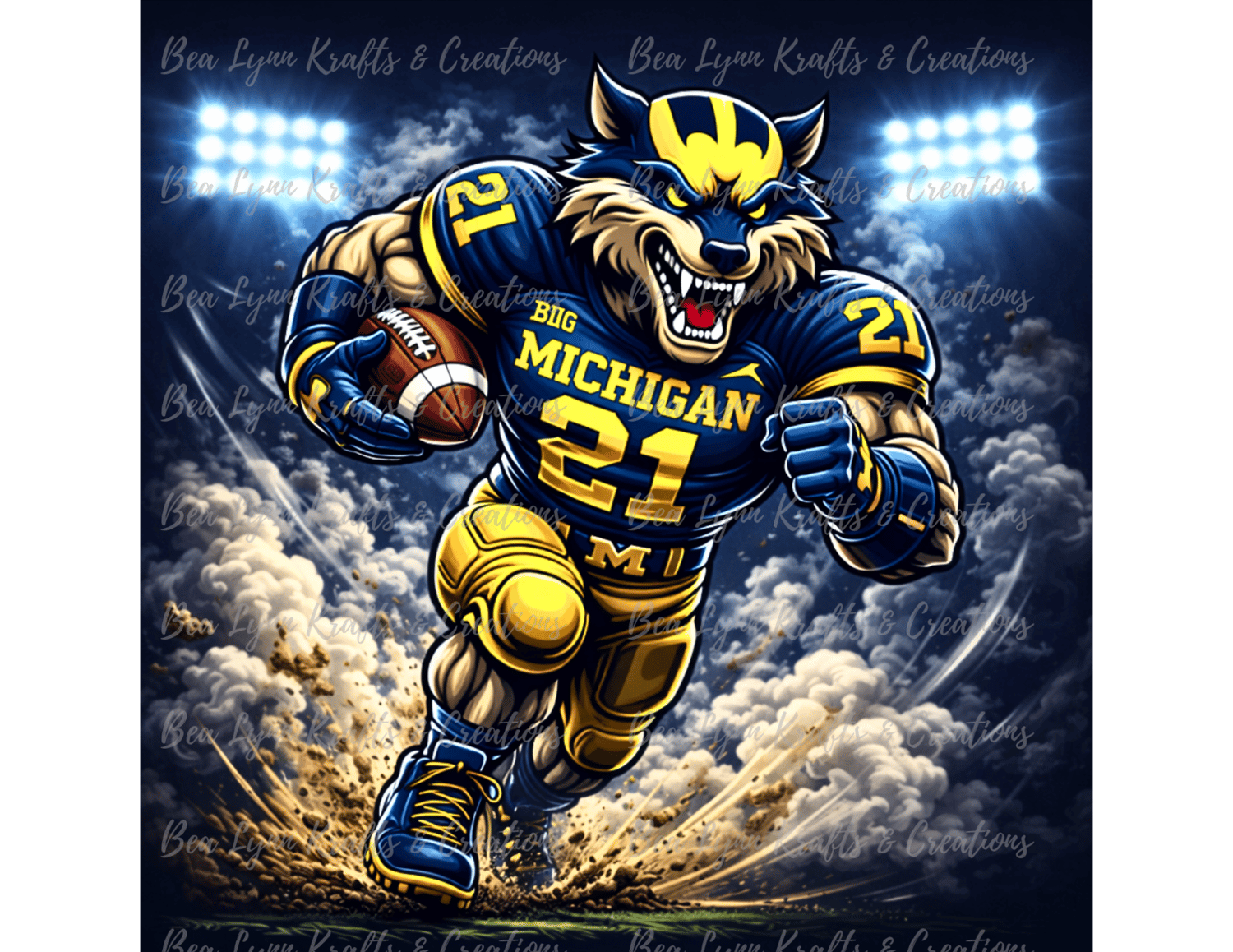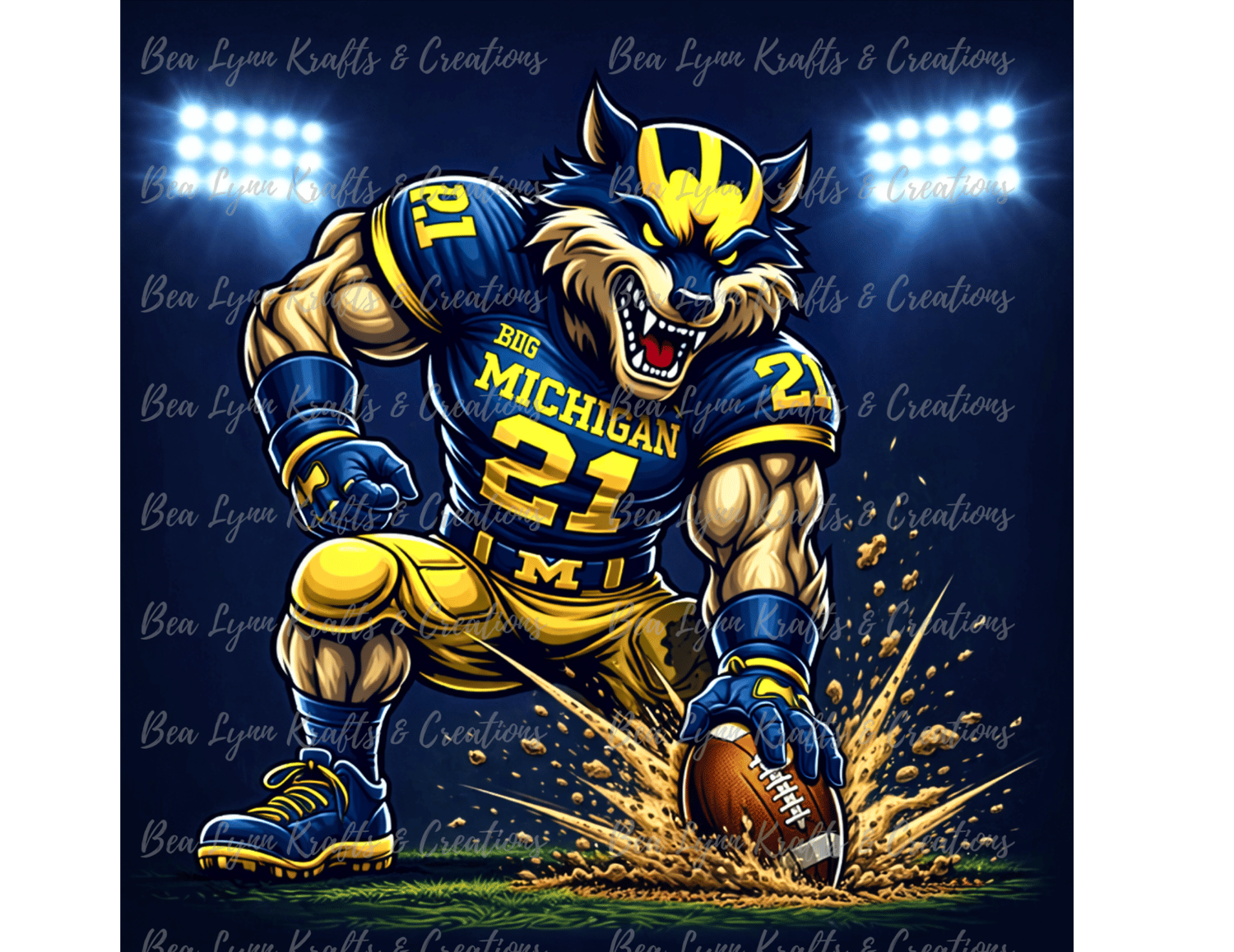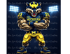 Bring powerful football energy to your designs with this Michigan Wolf Football Mascot Bundle. This collection includes 9 ultra-detailed sports mascot designs featuring intense action poses, bold navy and maize colors, and dramatic stadium lighting. Perfect for creating standout merchandise for football fans.