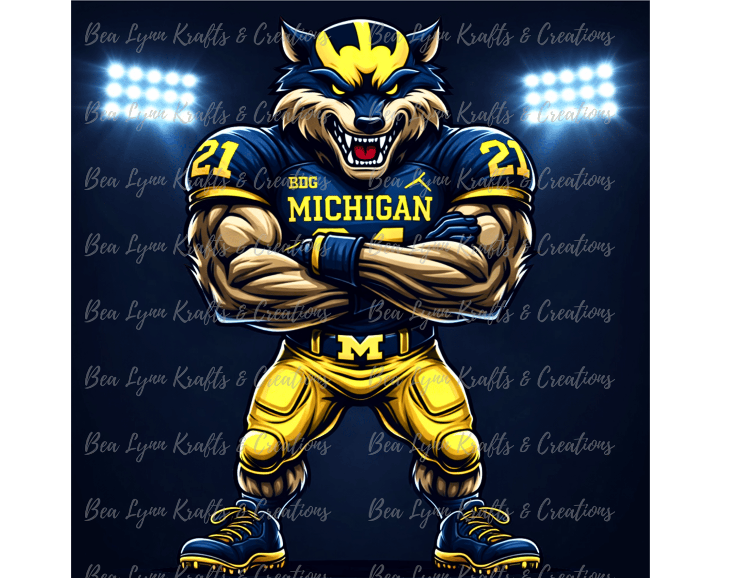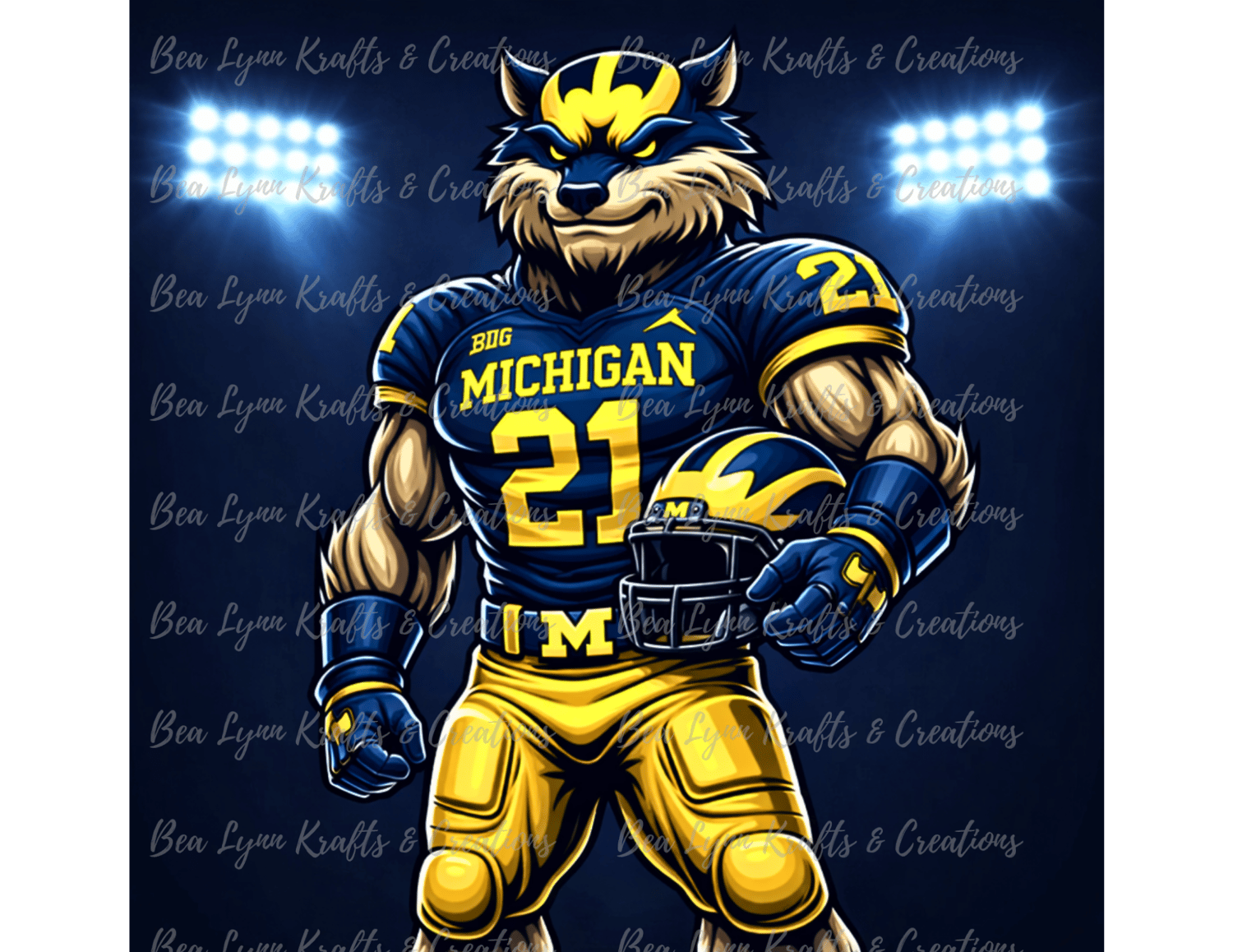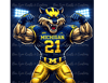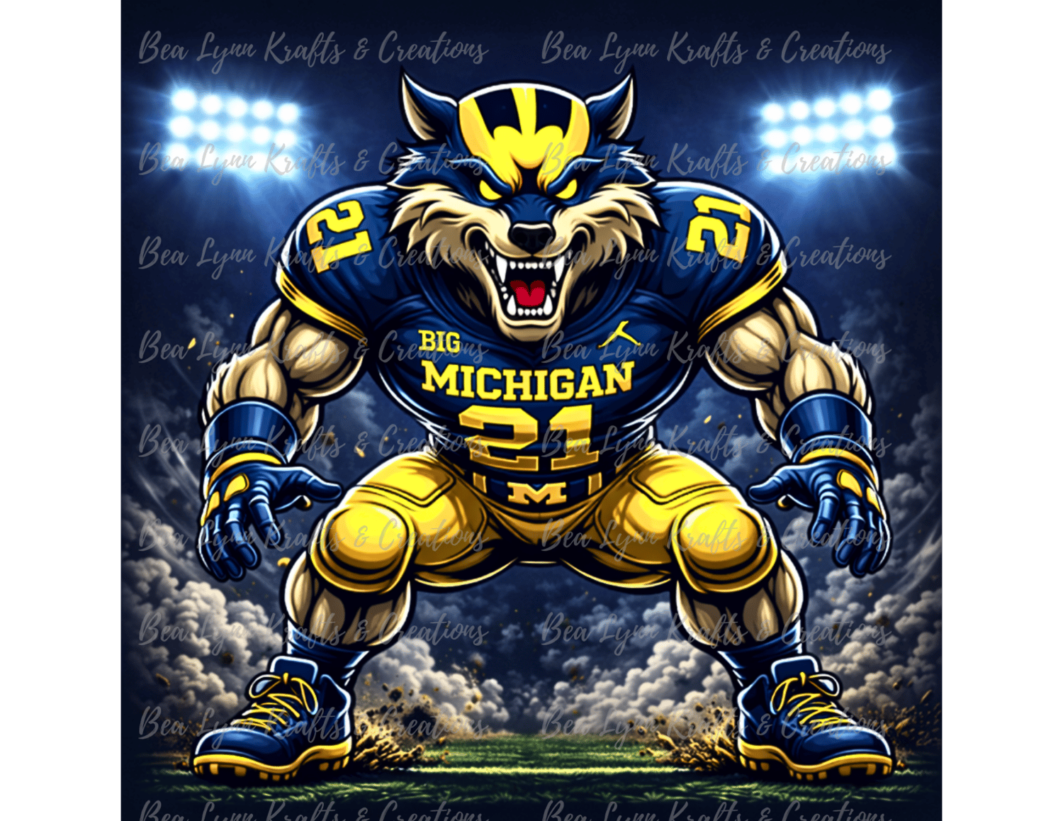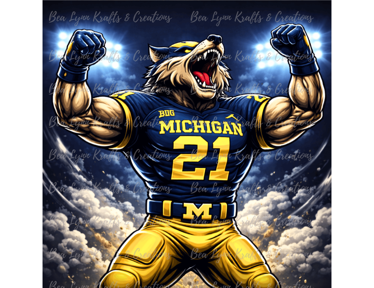 Bring powerful football energy to your designs with this Michigan Wolf Football Mascot Bundle. This collection includes 9 ultra-detailed sports mascot designs featuring intense action poses, bold navy and maize colors, and dramatic stadium lighting. Perfect for creating standout merchandise for football fans.
