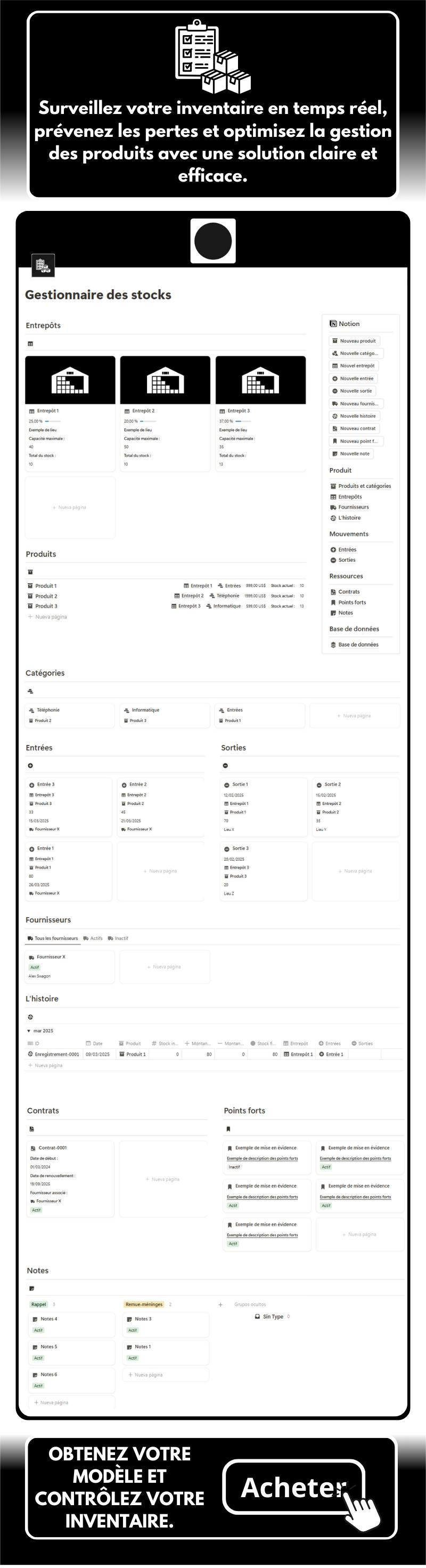 Ce modèle est idéal pour ceux qui recherchent une solution accessible et complète pour leur gestion d’inventaire. Que vous gériez une boutique en ligne, un entrepôt physique ou des produits numériques, vous garderez le contrôle sans avoir besoin d’outils complexes. Une manière simple de voir ce que vous avez, ce qu’il manque et ce qui bouge.