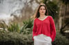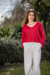 This sweater is knitted from the top down and seamlessly. We begin by working the back down to the armhole and leave it on hold. Then we work each front from stitches picked up at the shoulder and shape the neckline with increases. In the armhole, we join all the pieces and work the body in the round. The sleeves are knitted from the top down, beginning with the stitches picked up around the armhole.