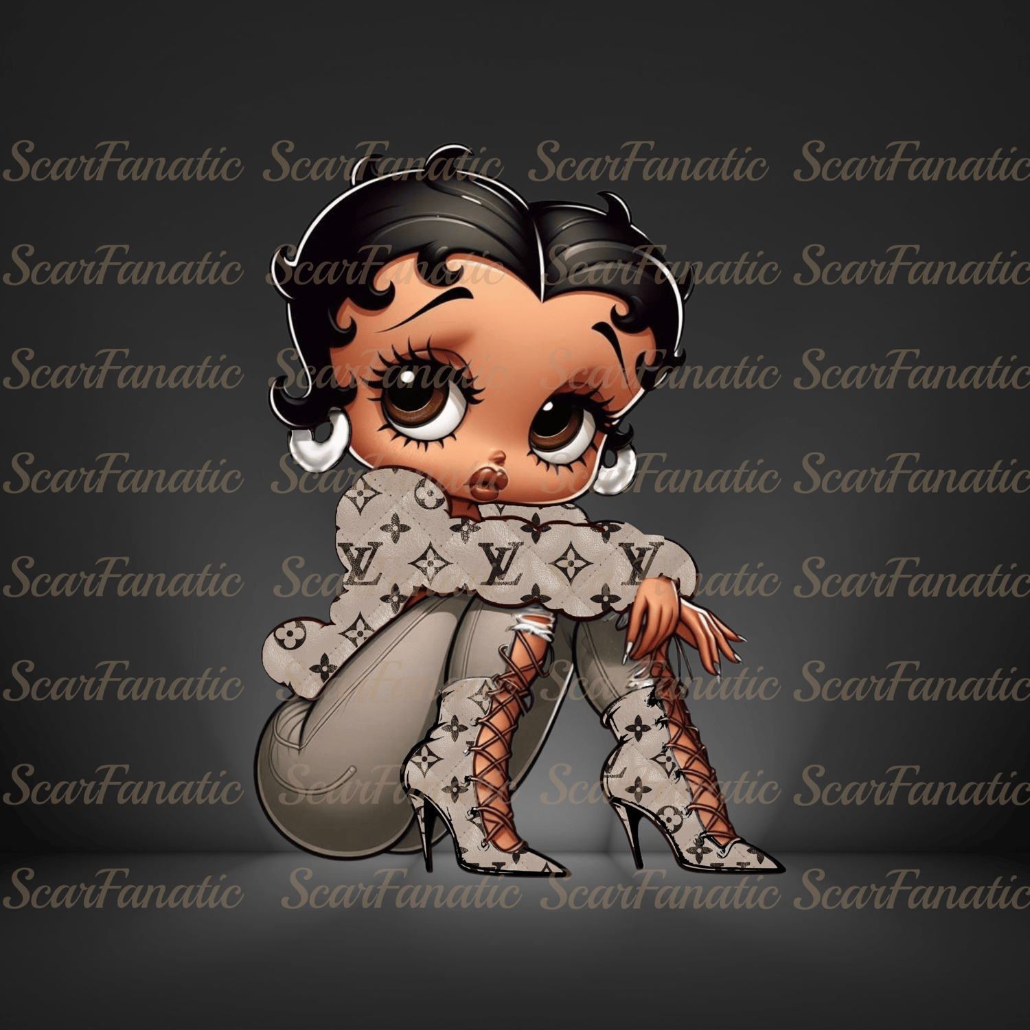 Black Betty Boop in Tan and Brown L and V symbols jacket and heels, beige jeans, high heel boots, Sublimation, PNG, DTF, 300DPI, high resolution