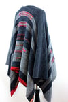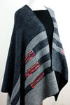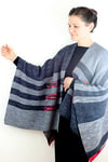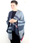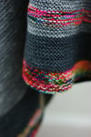 Wrap & Run is a large square split down half the middle to make room for your head. It is made in two pieces (right and left) and then joined at the top to knit the back from the top down forming a seamless garment. It’s a great beginner project for someone who is ready to take on something larger than a shawl since it is very simple and uses almost all garter stitch. There is also an option for a 3 needle bindoff at the shoulders if you’d like to do it in three separate pieces, from the bottom up. The left side is shorter than the right side (by design and not because I can’t count rows) and the stripes are offset to make it flattering.