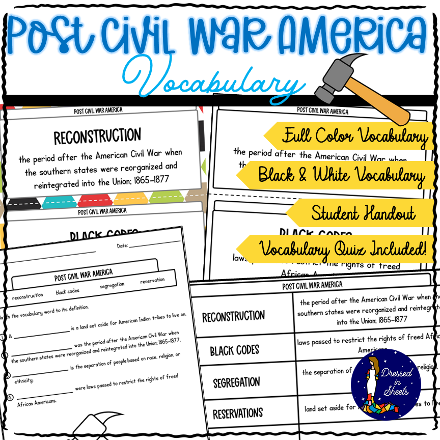 Students will learn new vocabulary words related to Post Civil War America, review them with the handy dandy student version included, and get quizzed on the vocabulary words. This will prepare your students for quizzes, exams, and reading historical documents. Bridge the gap with this awesome vocabulary pack!