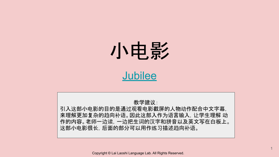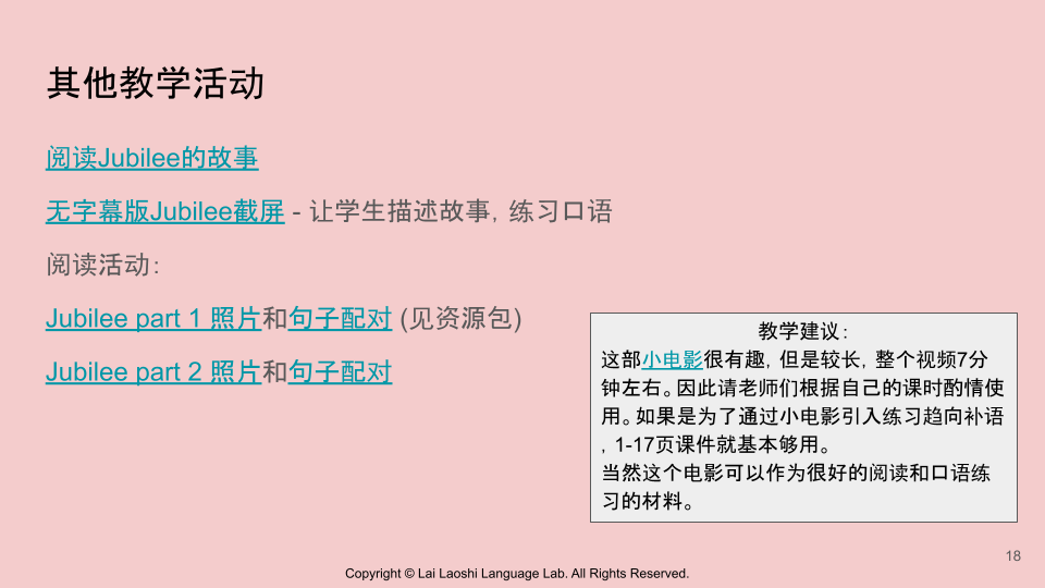 - 故事阅读材料:电影图片加字幕,可用于初读和复读活动。另外包含句子和图片配对阅读活动。