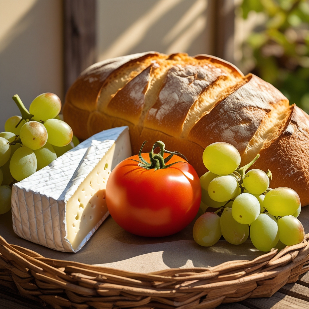 A vibrant and colorful still life photograph of a variety of appealing foods, including a juicy, ripe tomato, a crispy, golden-brown bread loaf, a wedge of creamy, white brie cheese, and a handful of fresh, green grapes, arranged artfully on a rustic, wooden table or woven basket, set against a warm, natural background, such as a sunny kitchen or outdoors in a garden, with soft, warm lighting and subtle shadows, evoking feelings of warmth, comfort, and appetizing freshness.