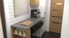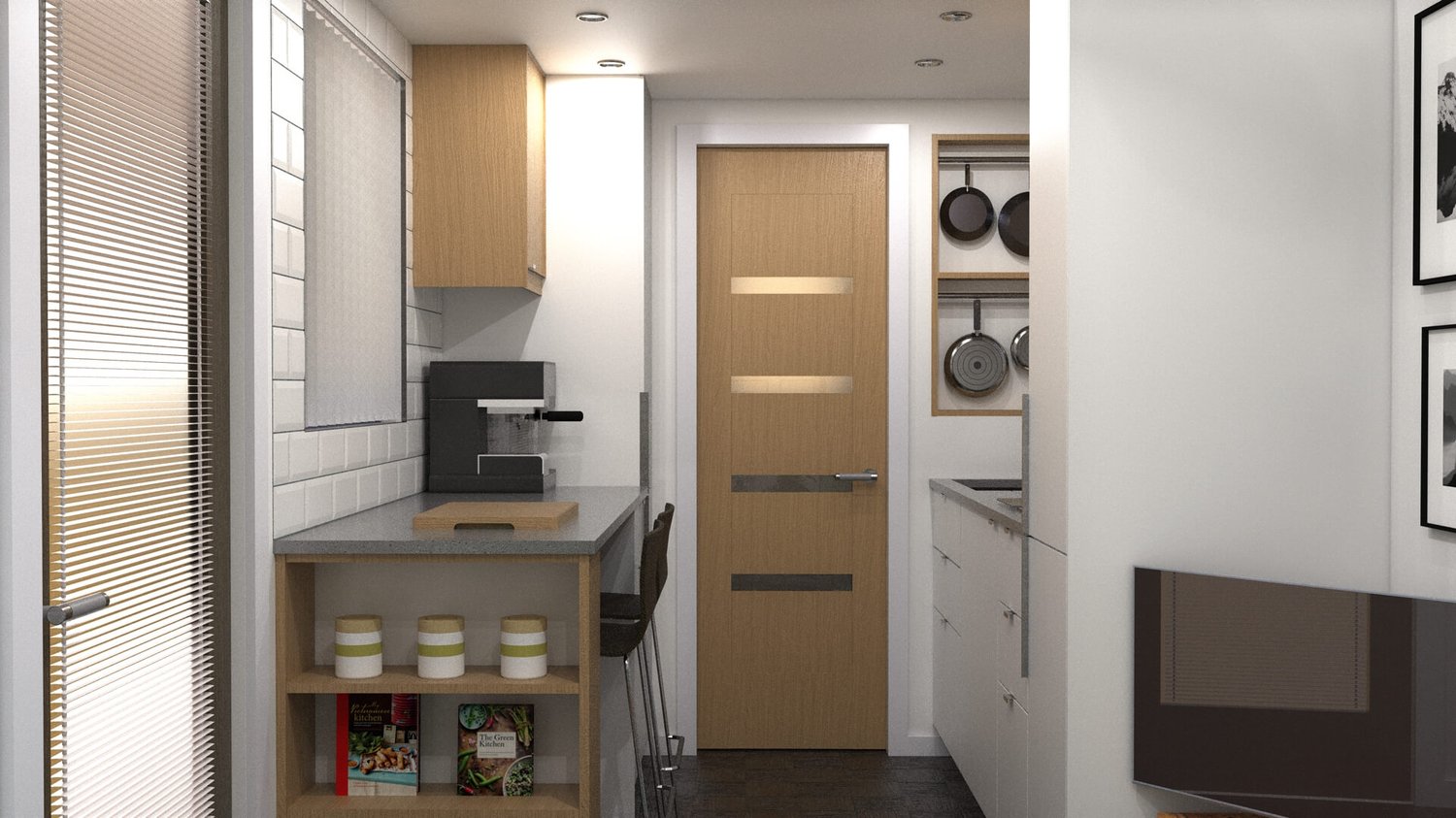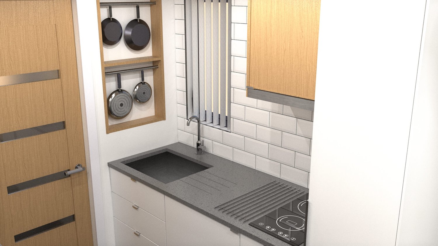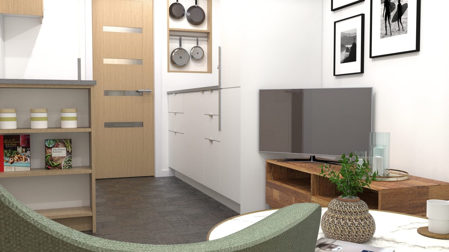 Connected seamlessly to the living room, the kitchen welcomes you with an open-plan layout. A dining/breakfast bar for two graces one side, featuring storage below for your convenience. On the opposite side, discover all your kitchen essentials – a sink, a two-burner cook-top, and a refrigerator, ensuring your culinary adventures are a breeze. Plus, the kitchen boasts two pull-out pantries, ideal for stashing away your odds and ends.