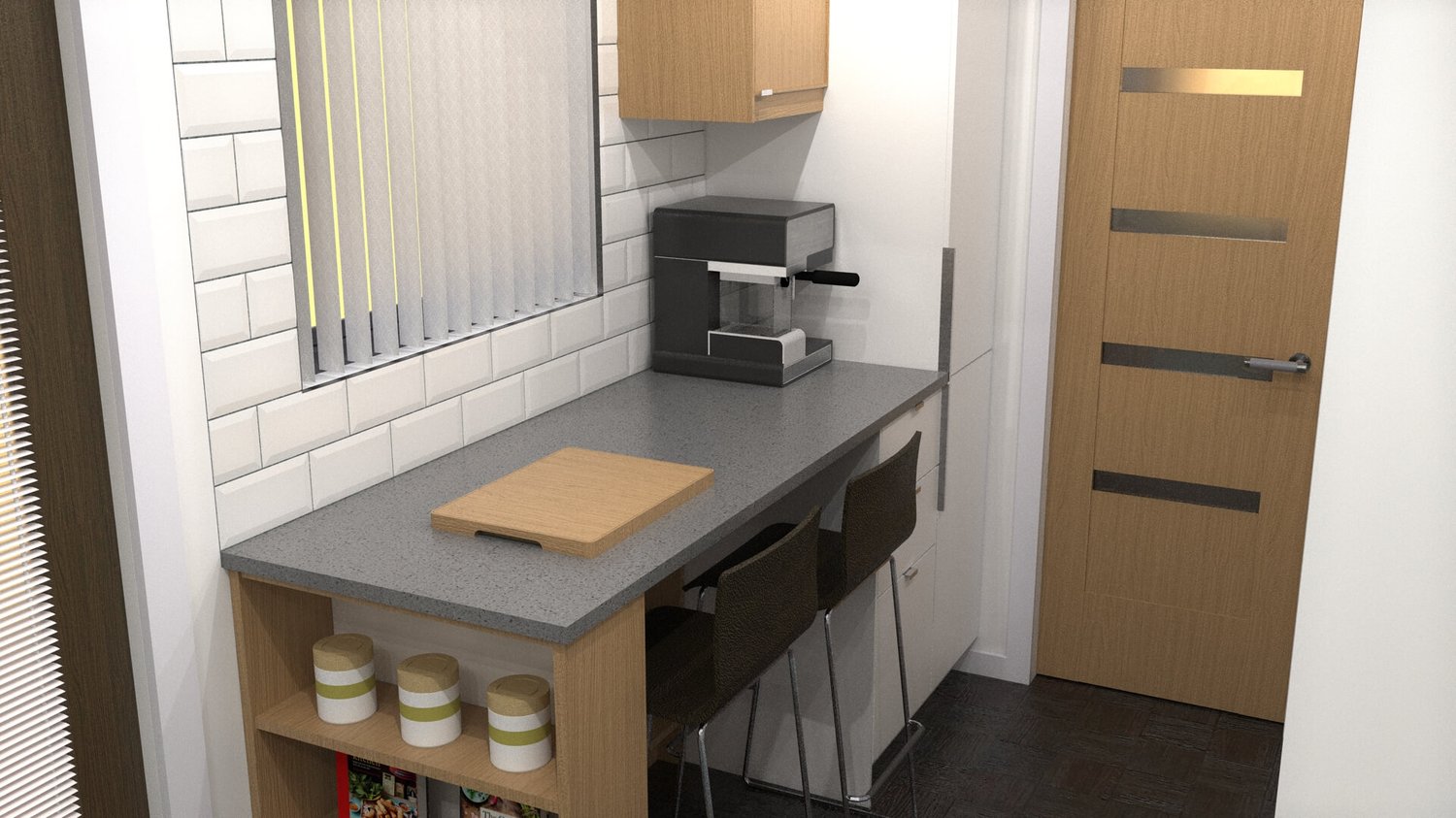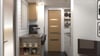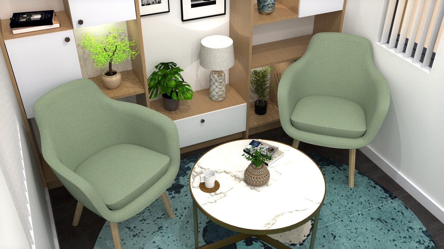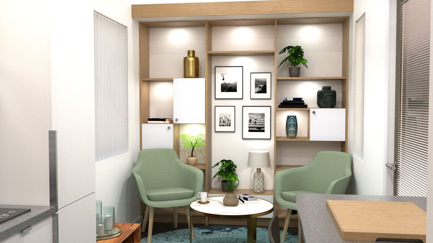 Step into the inviting living room adorned with two plush armchairs, perfect for relaxing after a long day. A chic coffee table graces the center, complemented by a spacious closet/shelving unit catering to all your storage needs. Natural light streams through the surrounding windows, enhancing the airy atmosphere within. Additionally, a wall-mounted TV space is available, allowing you to unwind and enjoy your favorite shows. For versatility, the armchairs can be replaced with a small sofa-bed, offering an extra sleeping spot if needed.