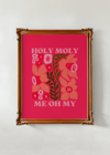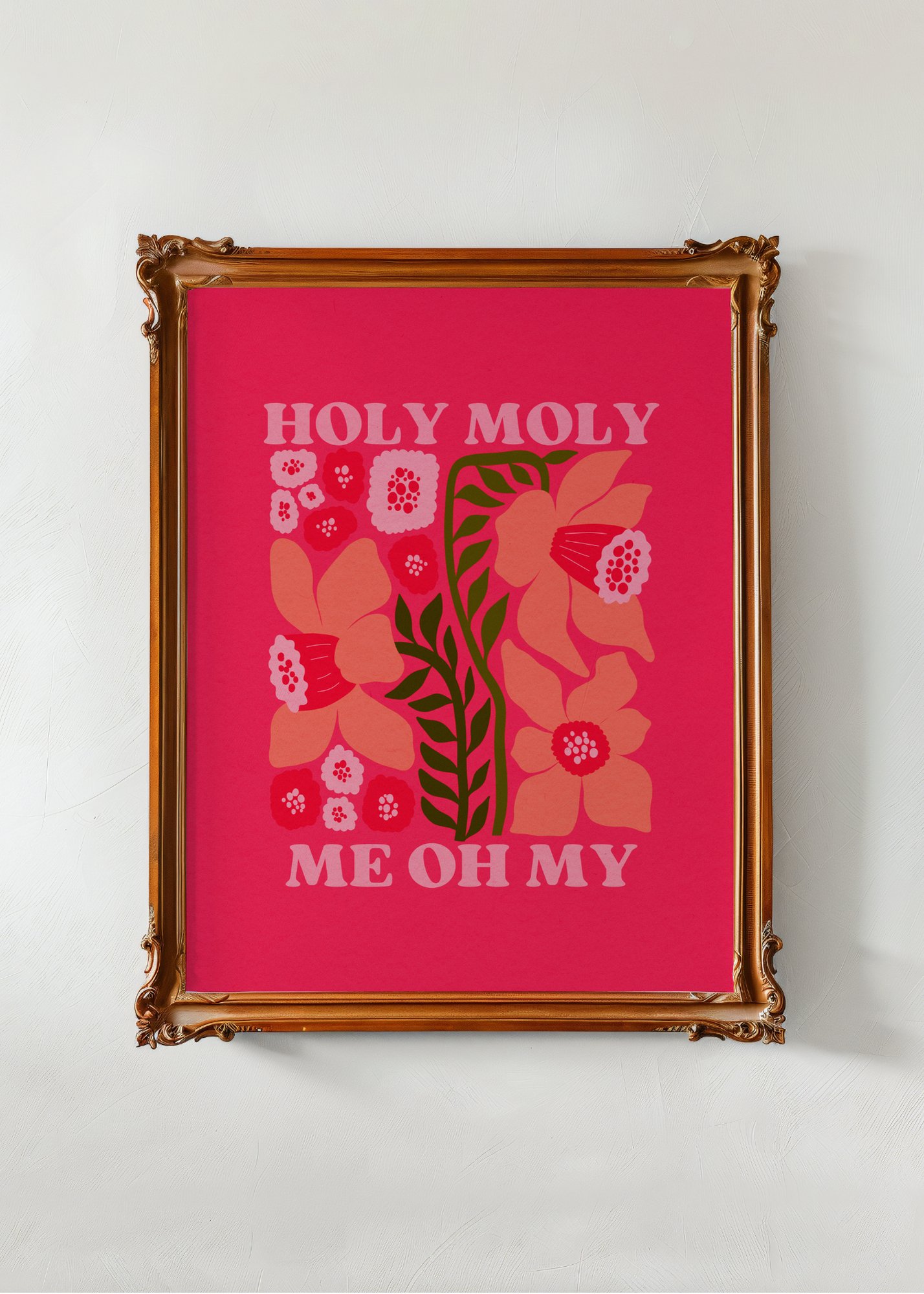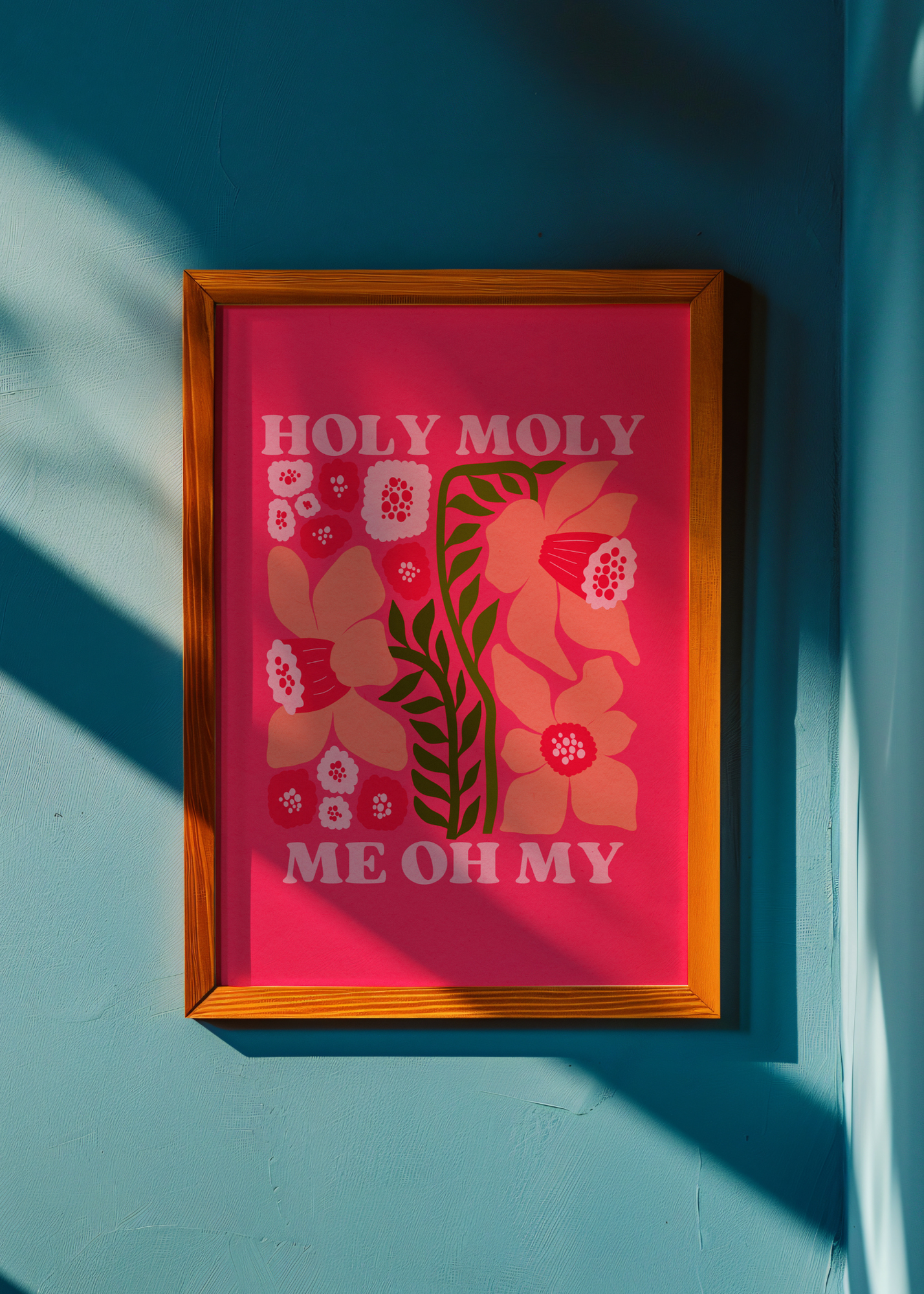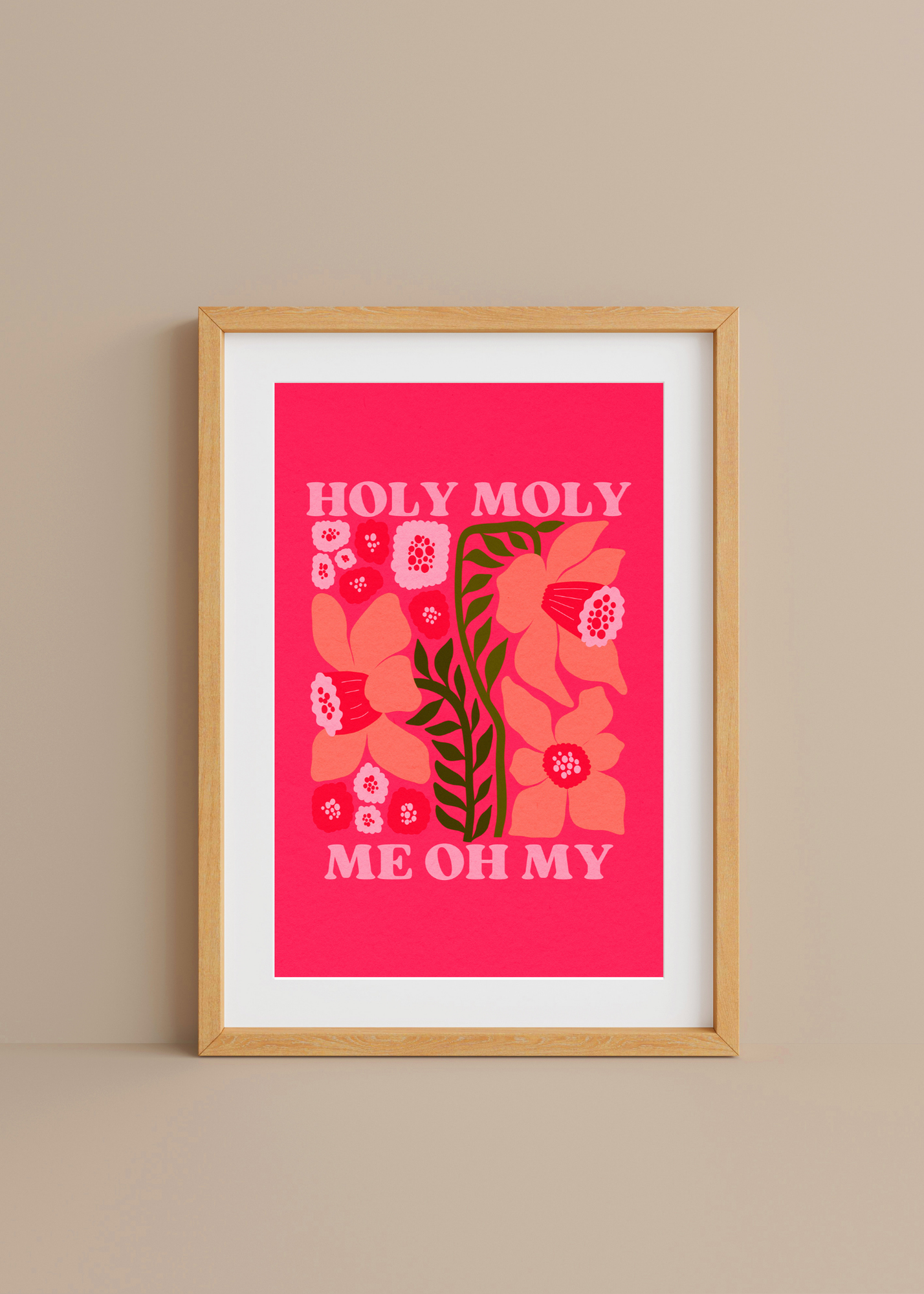 Holy Moly— Joyful and full of soul, this print has a bright and bold pink background and a dreamy floral bouquet in soft peach and salmon. At the top and bottom, in fun, flowing text, it exclaims: “Holy moly me oh my.” It feels like a favorite song lyric, a good hair day, and fresh cookies on a Sunday morning all rolled into one.