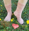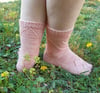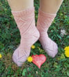 Pas du tout are worked in stockinette st., with lace motifs of hearts on the foot and on the ankle.
