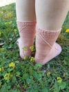 Pas du tout sont tricotées en jersey endroit, avec des motifs en dentelle sur le pied et la cheville.