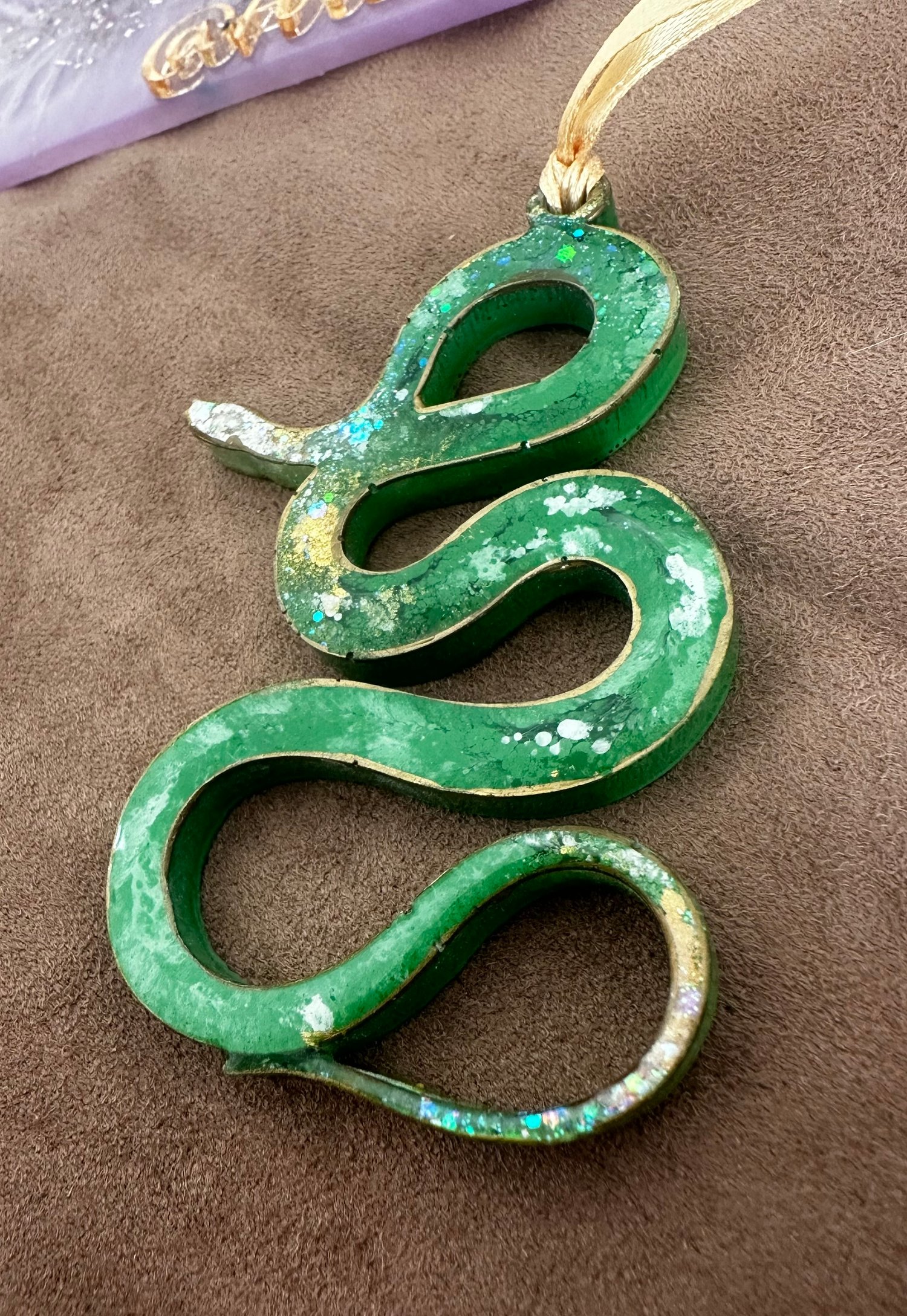 An exclusive ornament in the shape of an elegant green snake, the symbol of the upcoming year 2025. Handcrafted from premium Italian epoxy resin with refined gold accents and a glossy shimmering edge. This ornament is a stylish addition to your holiday décor or a meaningful gift for your loved ones.
