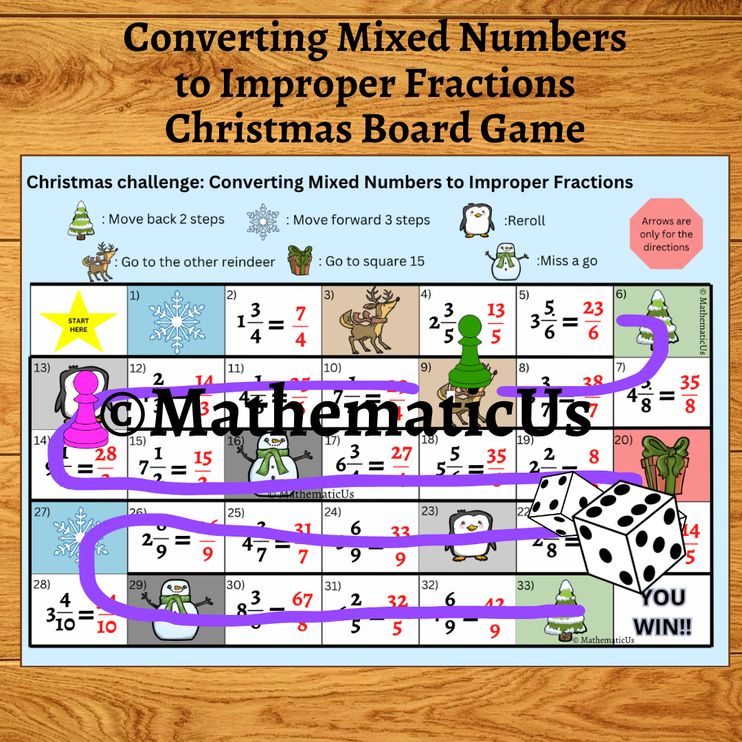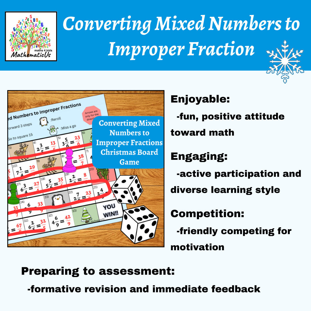 It is a Christmas math board game. Children will convert mixed numbers to improper fractions using all Times Tables. This math game is a great review and an engaging way to practice more in Converting Fractions. Children will have fun playing this dice game.