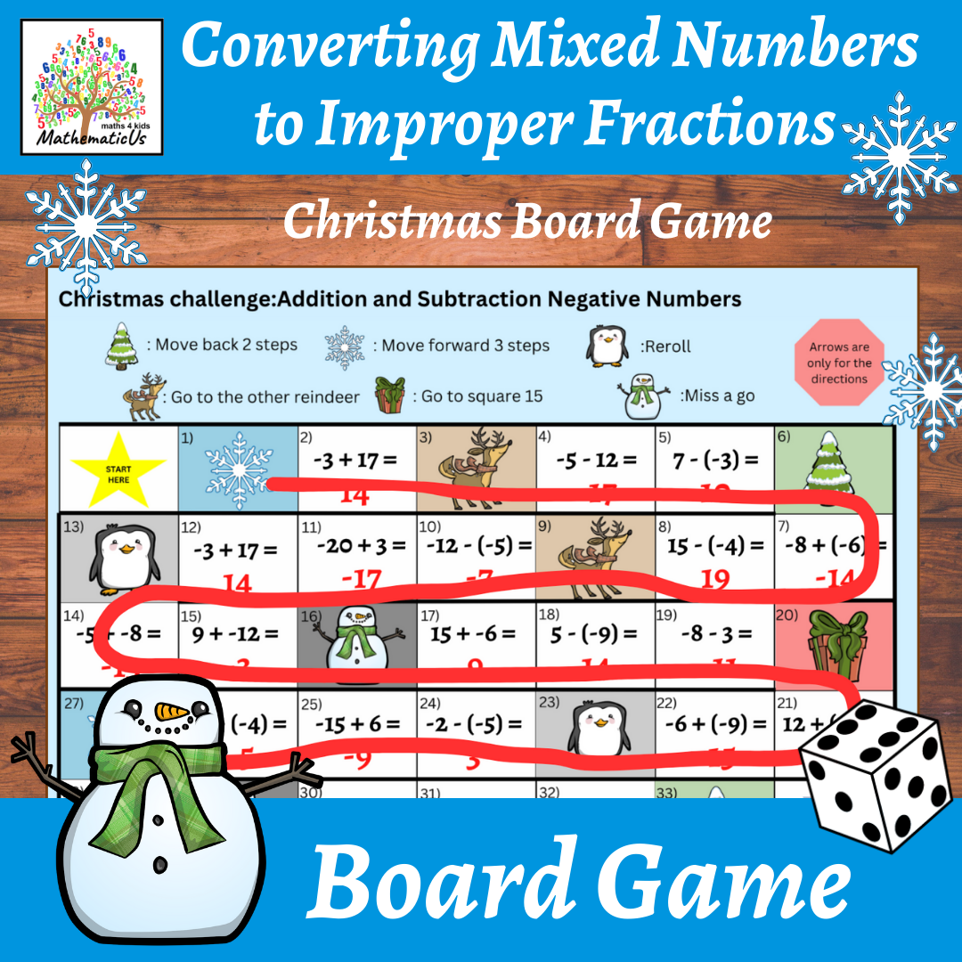 Converting Mixed Numbers to Improper Fractions Christmas Board Dice Game