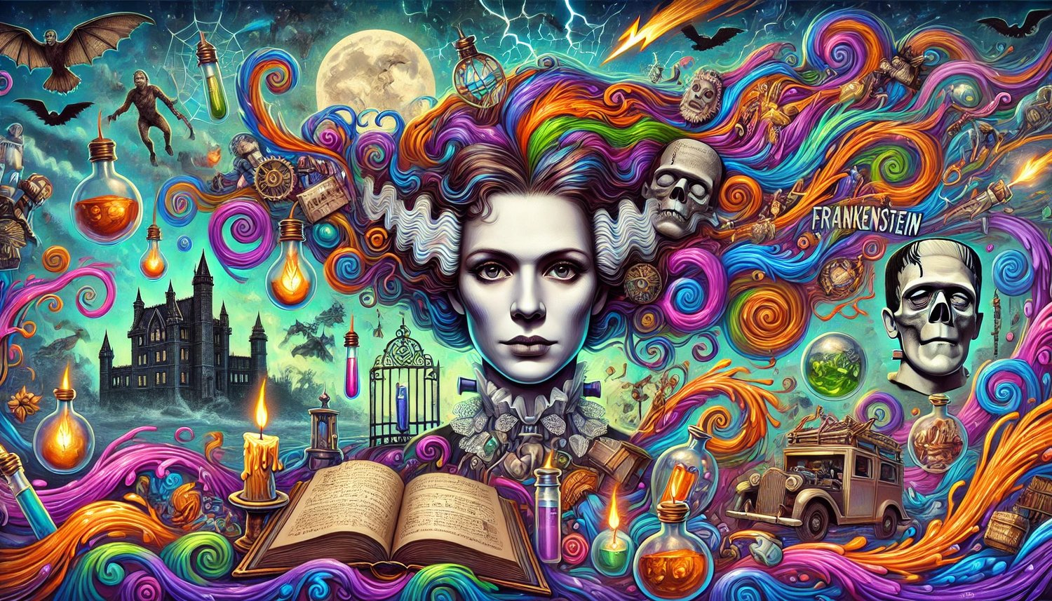 A vivid surrealistic caricature portrait of Mary Shelley, iconic author of “Frankenstein,” depicted with exaggerated, expressive features. Her hair erupts in fantastically colorful swirls filled with gothic symbolism—lightning bolts, laboratory equipment, floating manuscripts, and eerie candles—evoking her legendary tale. A mysterious gothic landscape of castles, stormy skies, and ghostly imagery serves as the backdrop, highlighting Shelley’s imaginative genius and haunting literary legacy.