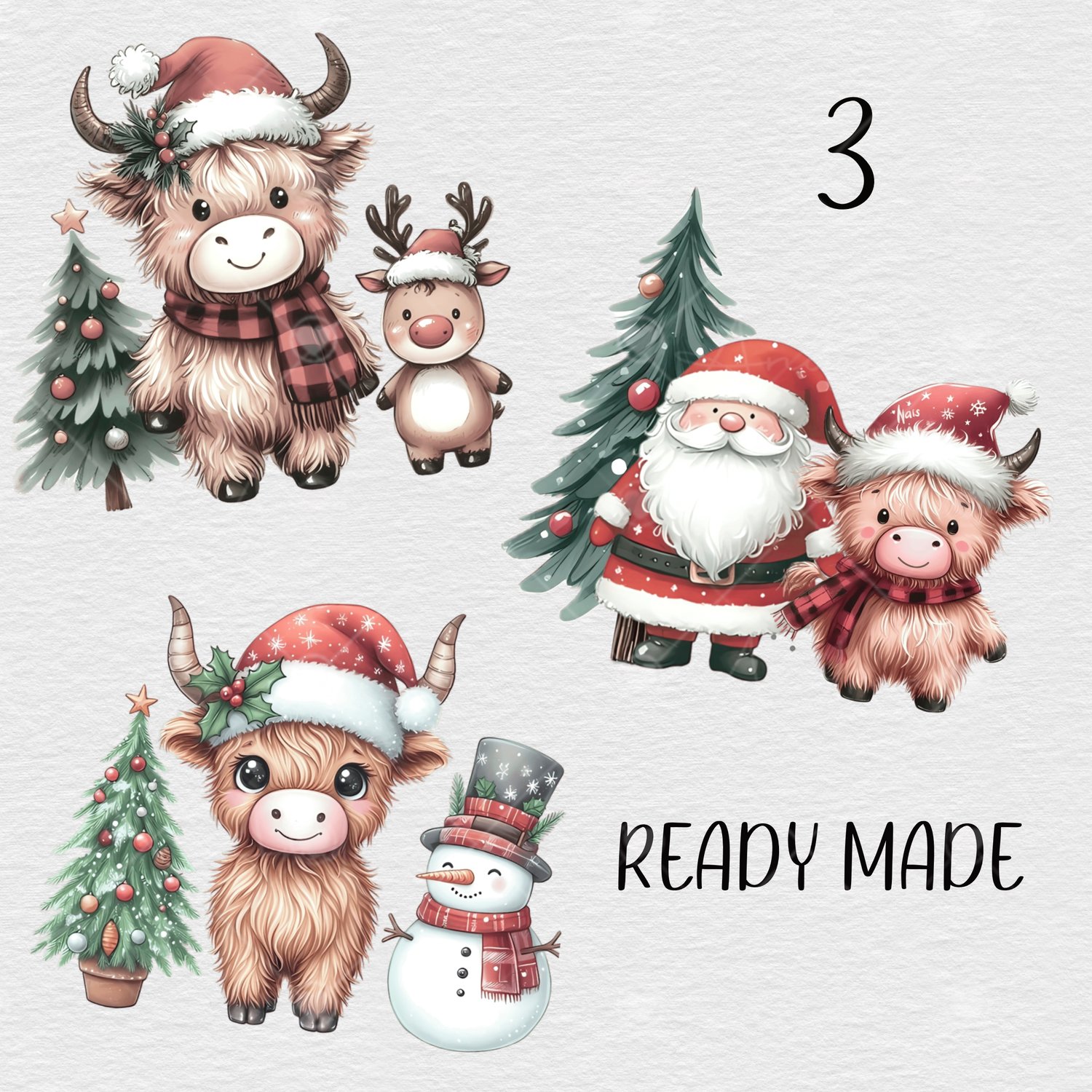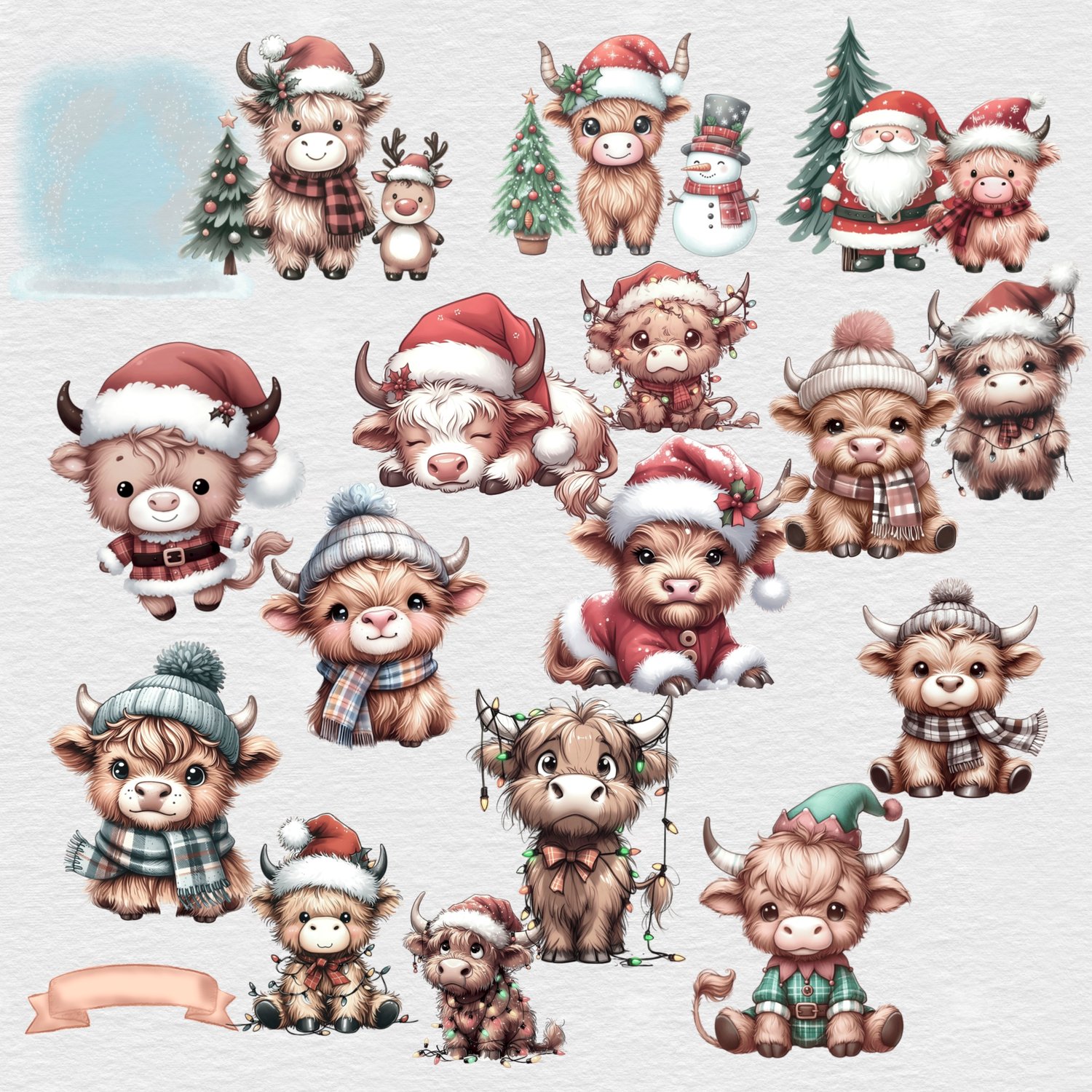Christmas Highland cow bundle. 18 PNGs, incl background and banner.