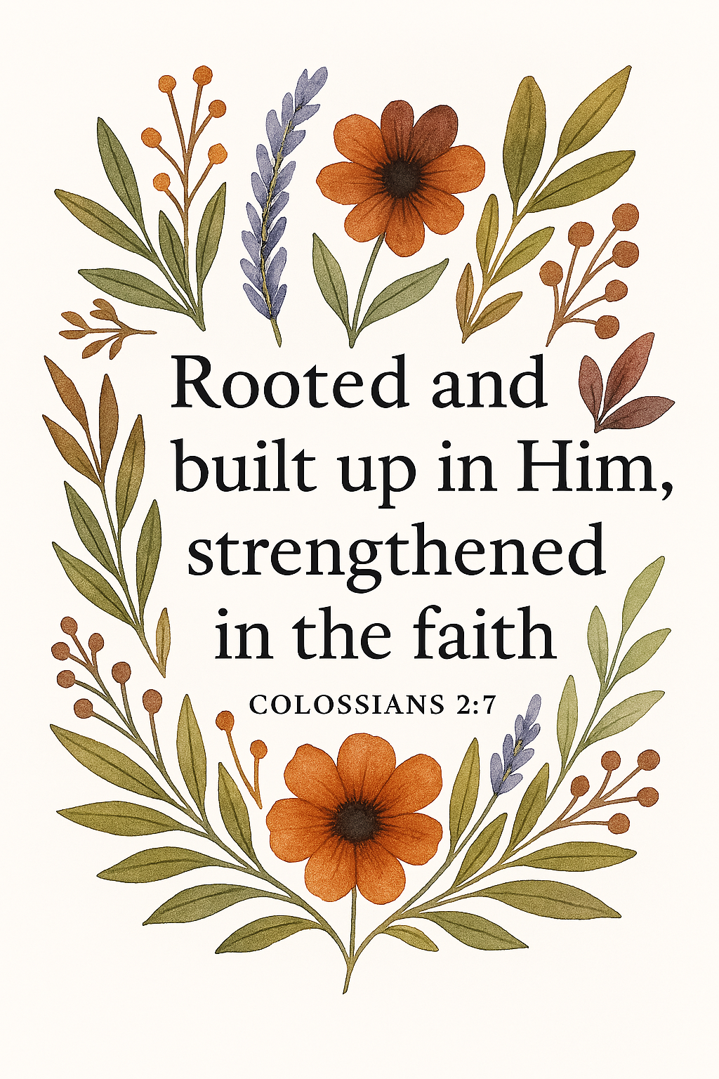 Celebrate spiritual growth and strength with this beautifully illustrated scripture from Colossians 2:7: