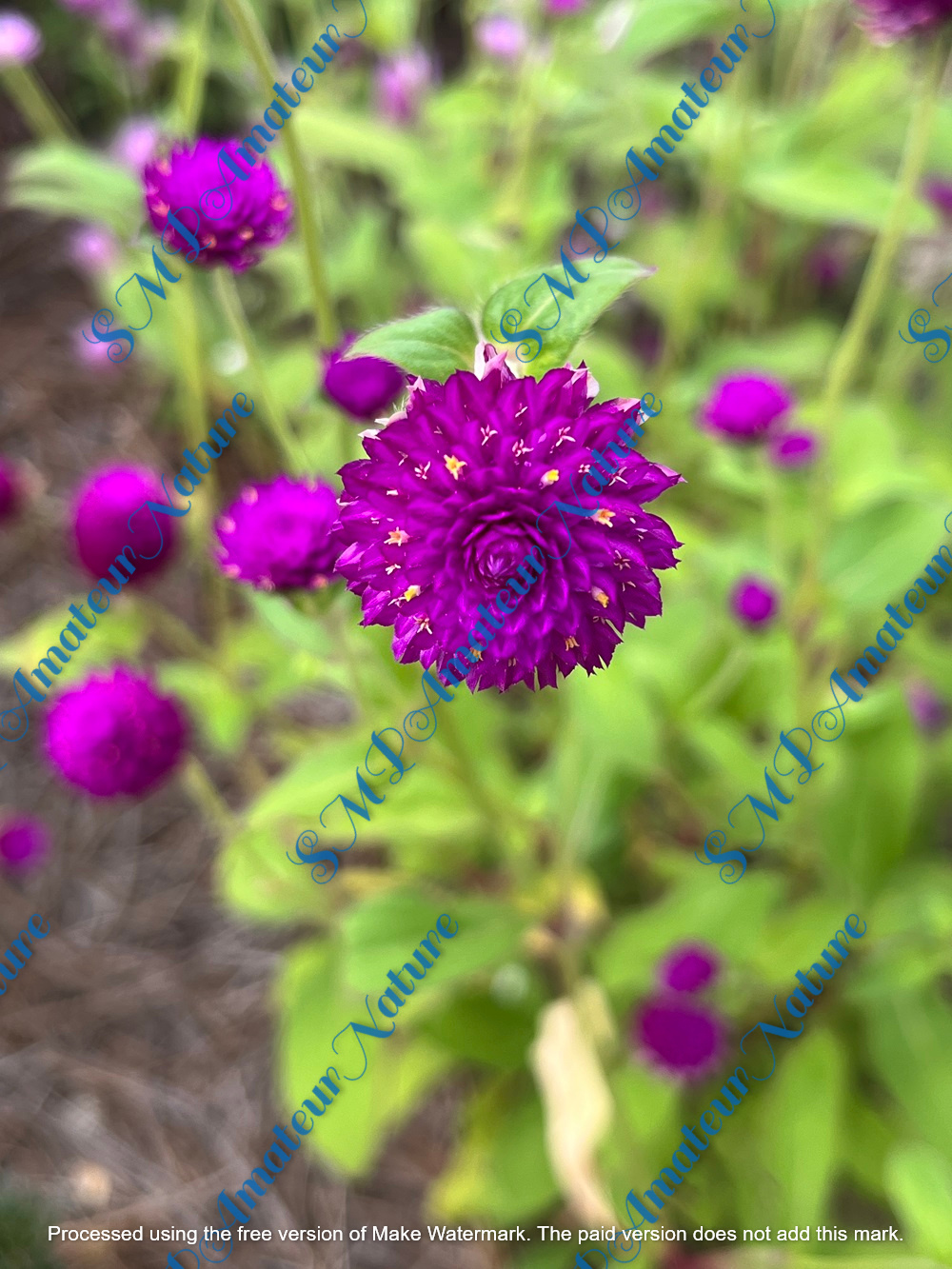 Amateur photograph of a patch of purple Globe Amaranth (Gomphrena globosa) flowers. Image taken in Virginia, USA. Image pixels 3024x4032. Image easily resized as required for buyer needs. Purchase gives image without any watermark.