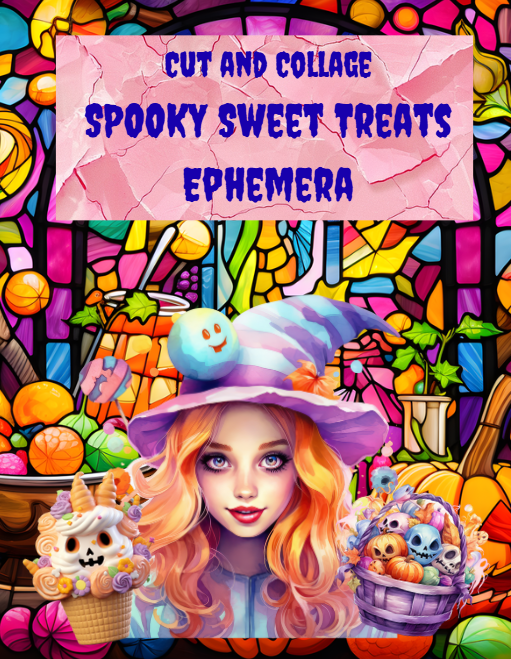 This Cut and Collage Spooky Sweet Treats Ephemera Book features: