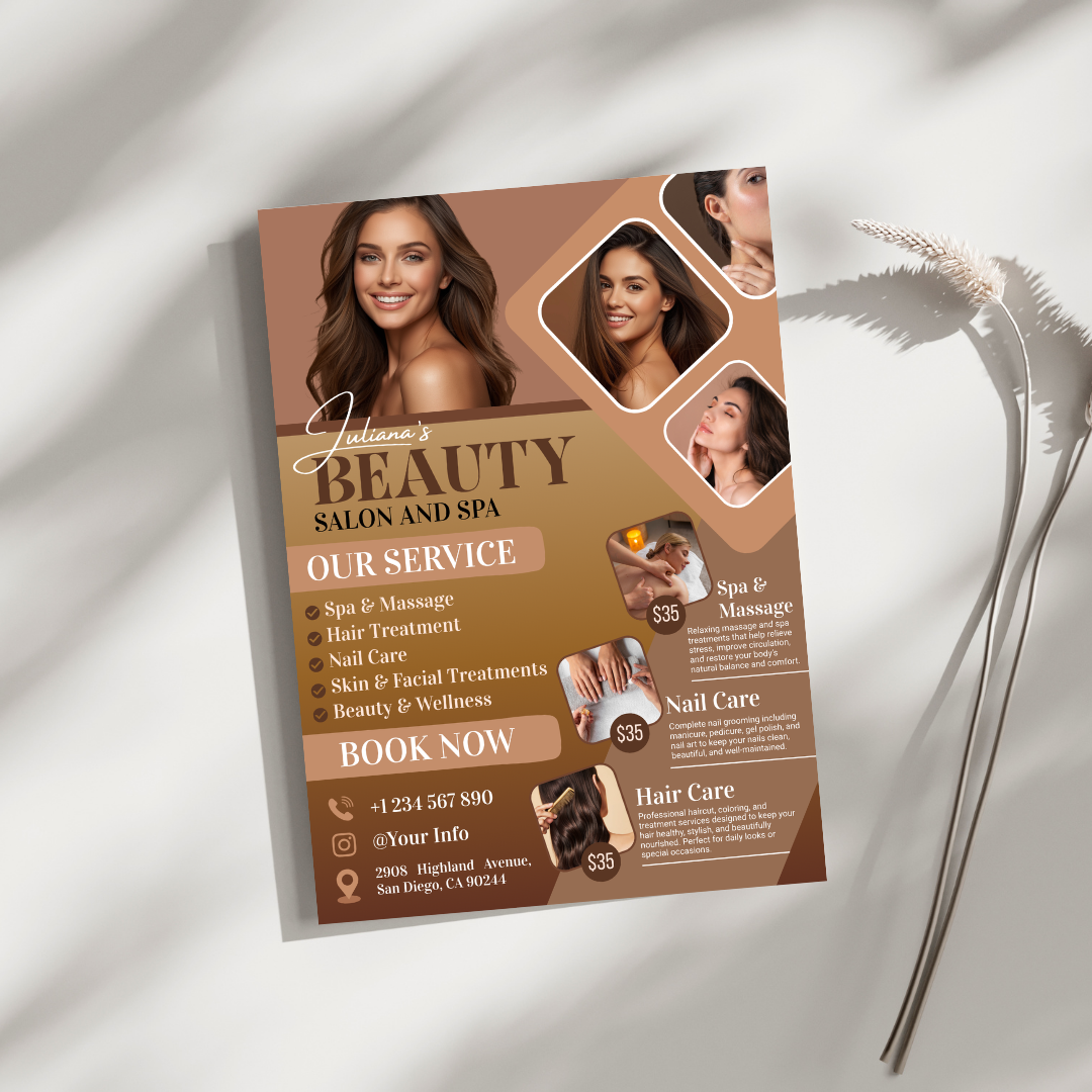 Promote your beauty salon, spa, or wellness business with this elegant and modern flyer template. Designed to attract customers instantly, this flyer is perfect for showcasing your services, price list, promotions, or special offers.