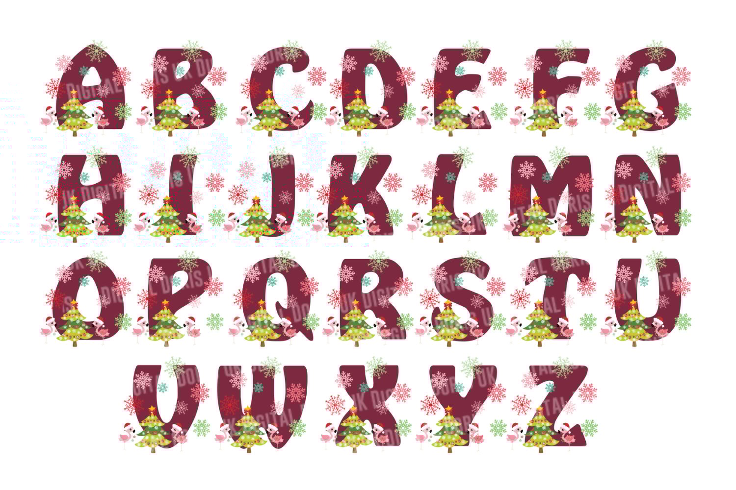 Flamingo Christmas with tree and snowflakes - Maroon- Alphabet Set Digital Download 26 PNGs