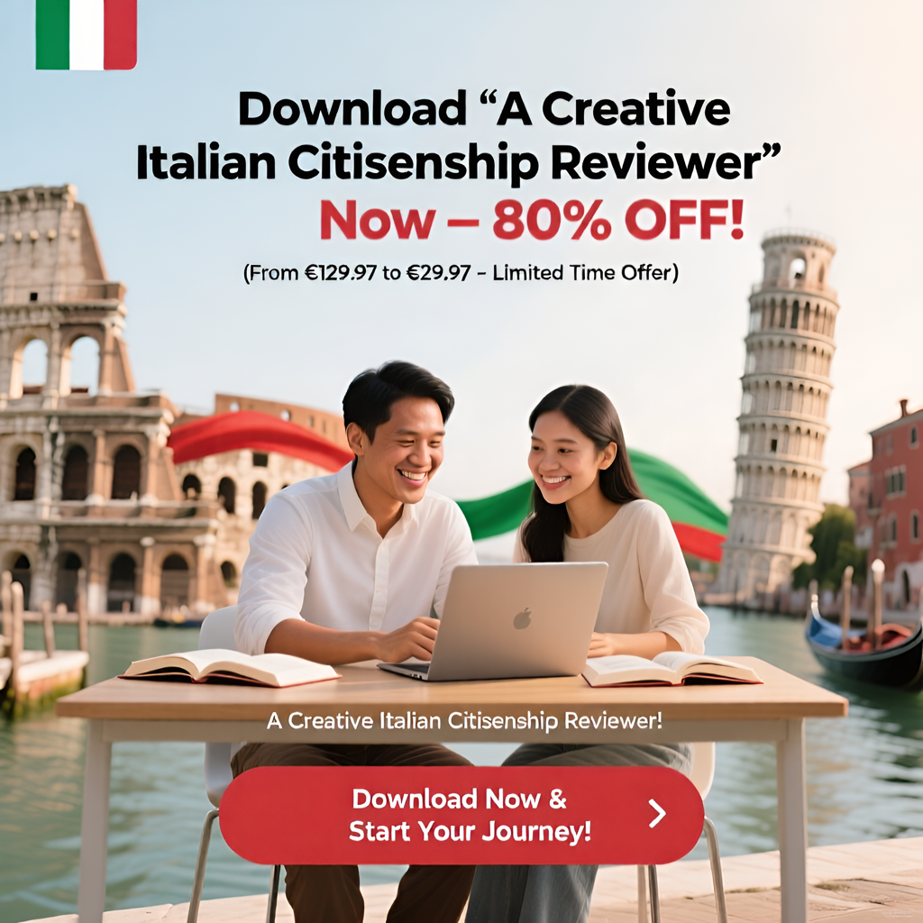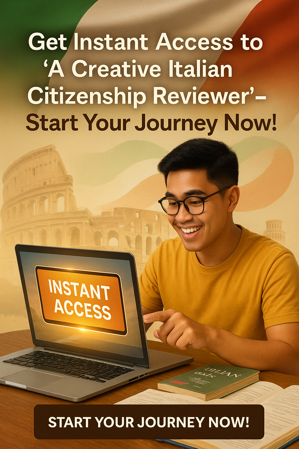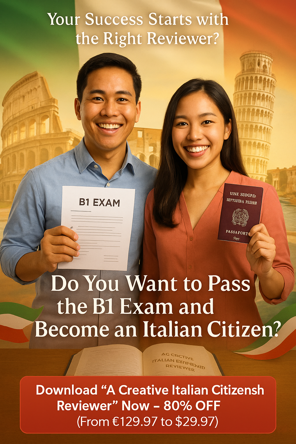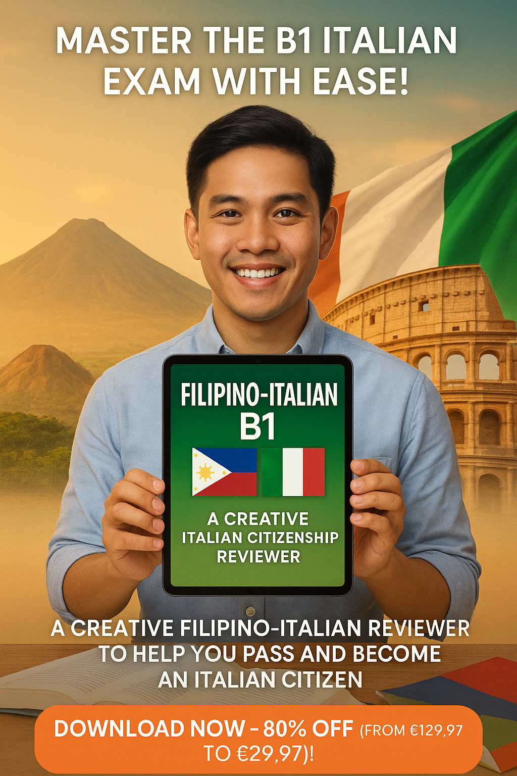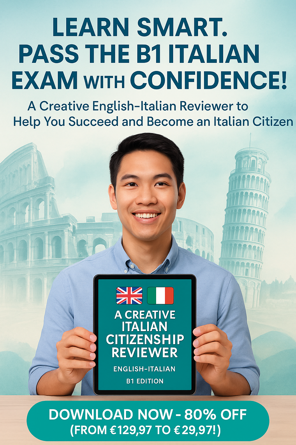 Ang “A Creative B1 Italian Citizenship Reviewer” ay espesyal na idinisenyo para sa mga Pilipinong gustong pumasa sa B1 Language Exam para sa Cittadinanza Italiana.
