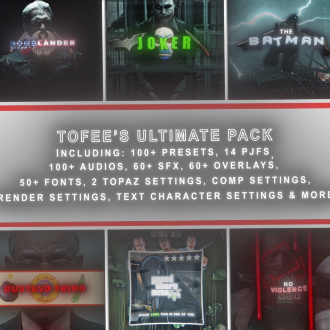 This pack includes 100+ presets, 14 project files, comp settings, render settings, text character settings, 2 topaz settings, 50+ fonts, 60+ sound effects, 60+ overlays, 100+ audios, tips & instructions. This pack includes all the resources that you will ever need for editing.