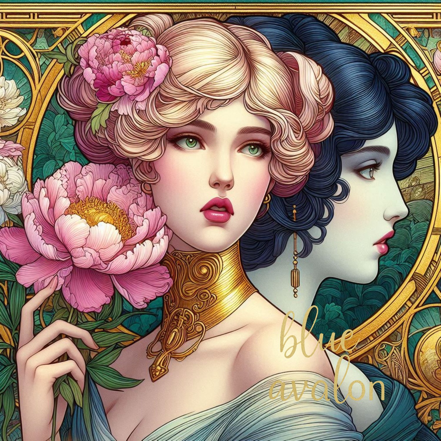 Two graceful women pose in a dreamlike Art Nouveau style - one blonde, one dark haired - their forms sculpted with photosurreal beauty. A soft pink peony graces one figure while a glowing gold circular backdrop frames them both, casting the scene in timeless elegance. Flowing lines, intricate detailing and a touch of vintage fantasy create a piece that feels like a relic of an enchanted era - feminine elegant, and quietly powerful.