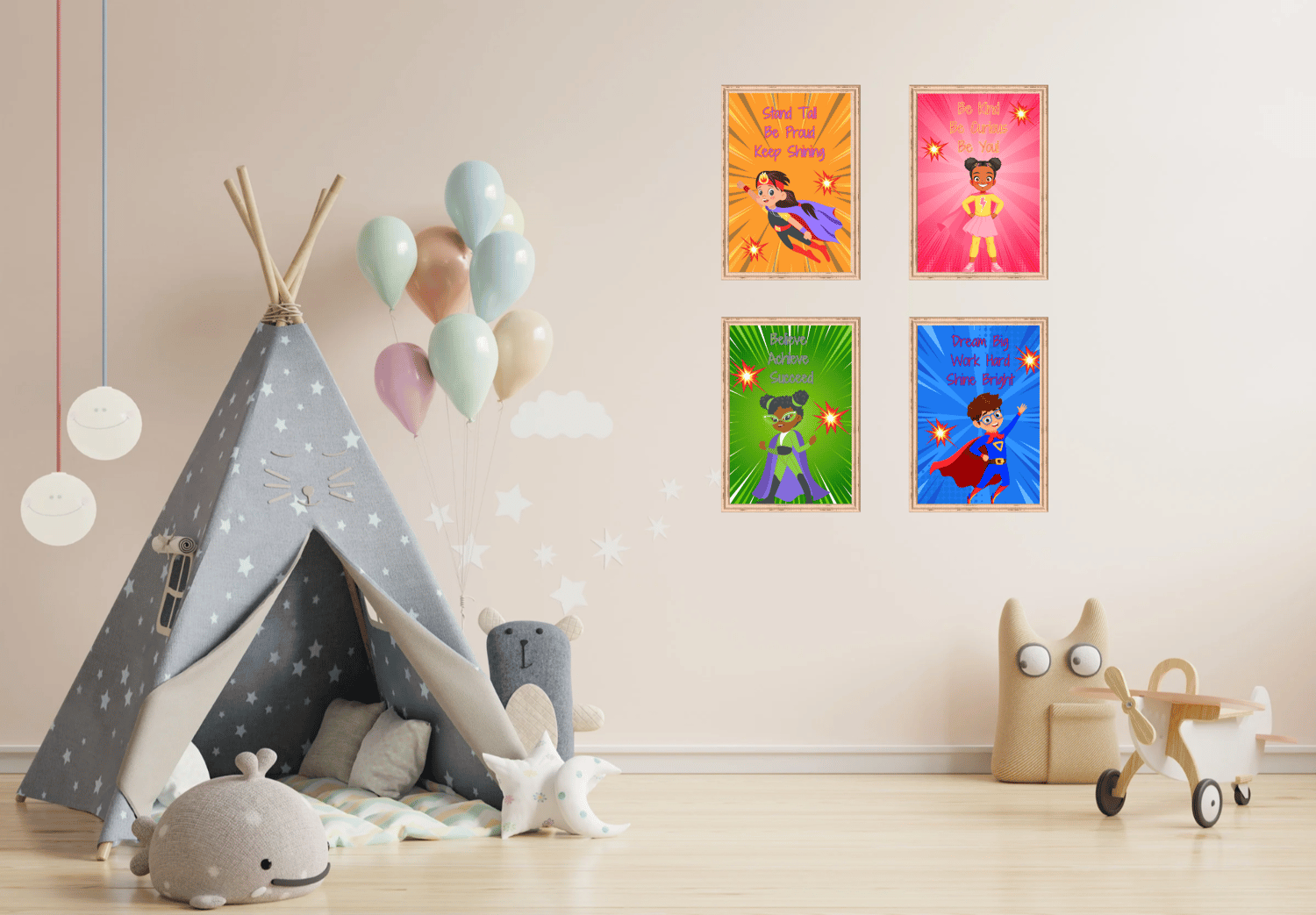 Calling all heroes! This bright, empowering set features four animal superheroes ready to inspire bravery, kindness, and imagination. A perfect addition to any child’s superhero-themed bedroom or playroom.