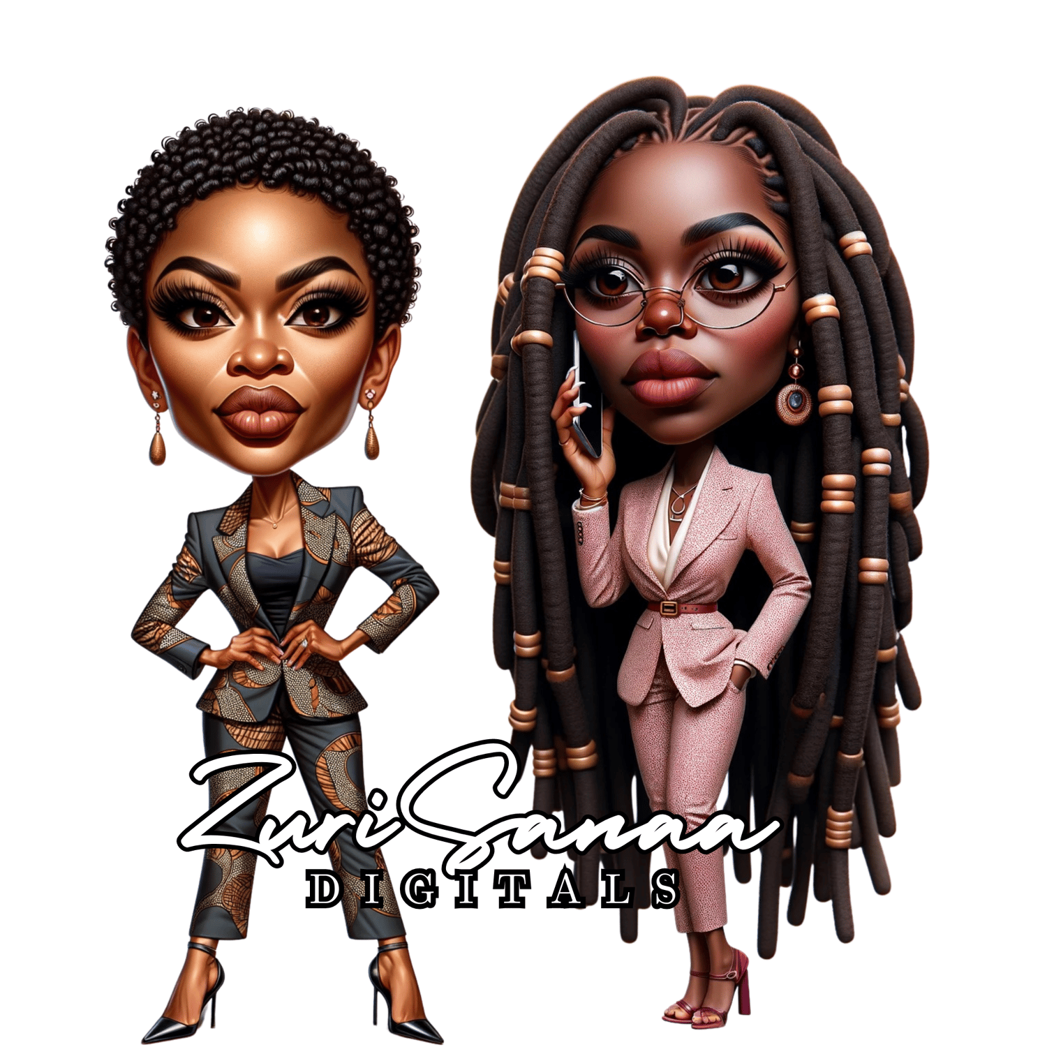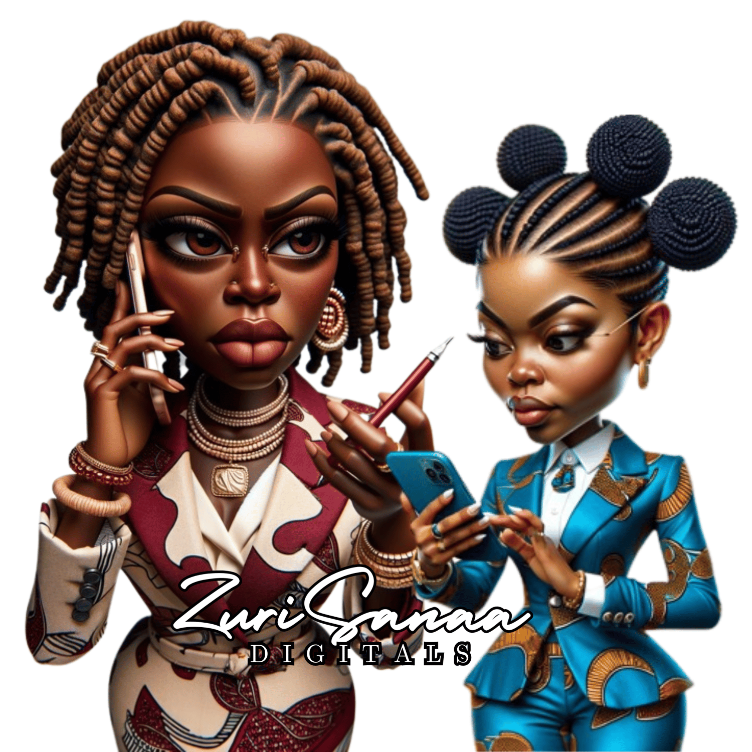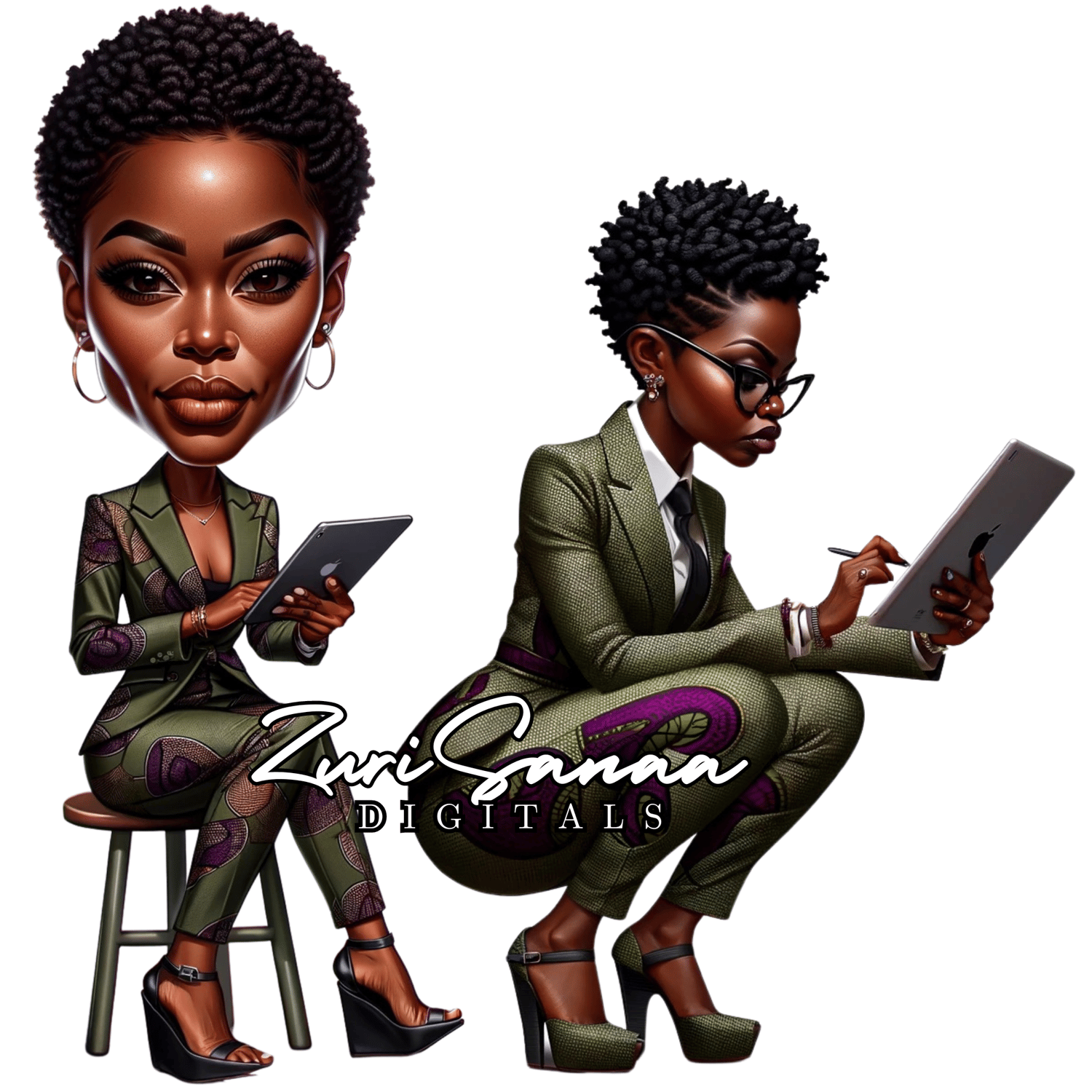 Step into the world of elegance and empowerment with our exclusive 13 PNG Bundle! Crafted for the modern, confident woman, these high-resolution digital images feature stunning caricatures of a strong Black woman. She's dressed in vibrant Ankara print business suits, adorned with loc jewelry, and radiates unwavering confidence and poise. Each image captures the essence of strength and professionalism, making this bundle perfect for your creative projects.