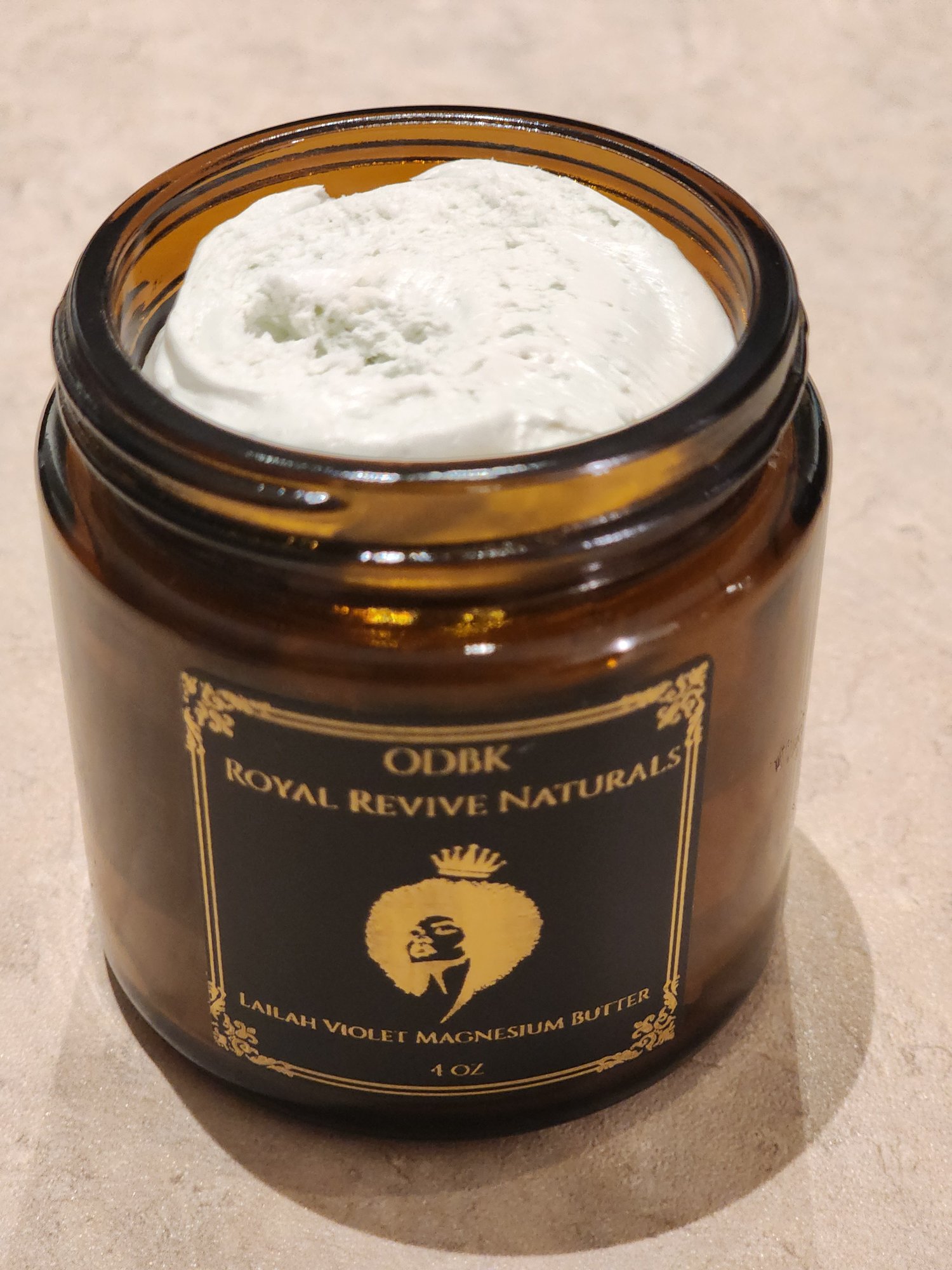Ingredients : Water , Magnesium Chloride, Shea Butter, Kokum Butter, Mango Butter, Castor Oil (infused w/ chamomile, valerian, lemon balm, lavender), Aloe Vera Oil, Emulsifying Wax, Candelila Wax , Beeswax, Vitamin E , Arrowroot Powder, Geogard Ultra Preservative, Lailah Violet Fragrance Oil, Purple Mica