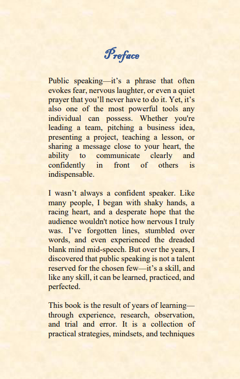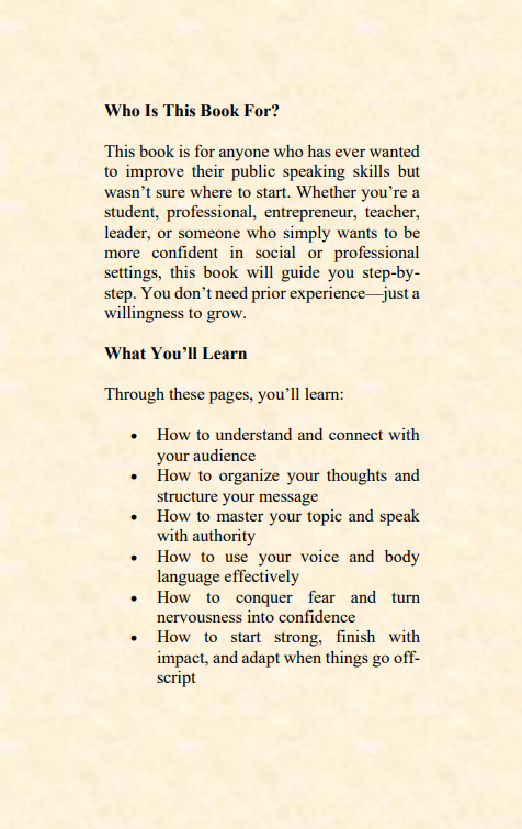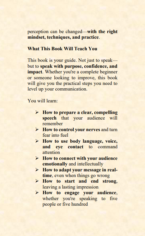 This isn’t a textbook filled with theory—it’s a toolkit for real people with real goals. Whether you're a beginner terrified of speaking in public or an experienced communicator looking to sharpen your skills, you’ll find actionable advice, relatable stories, and transformative tips you can apply immediately.